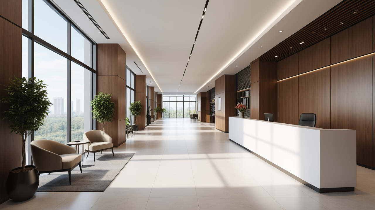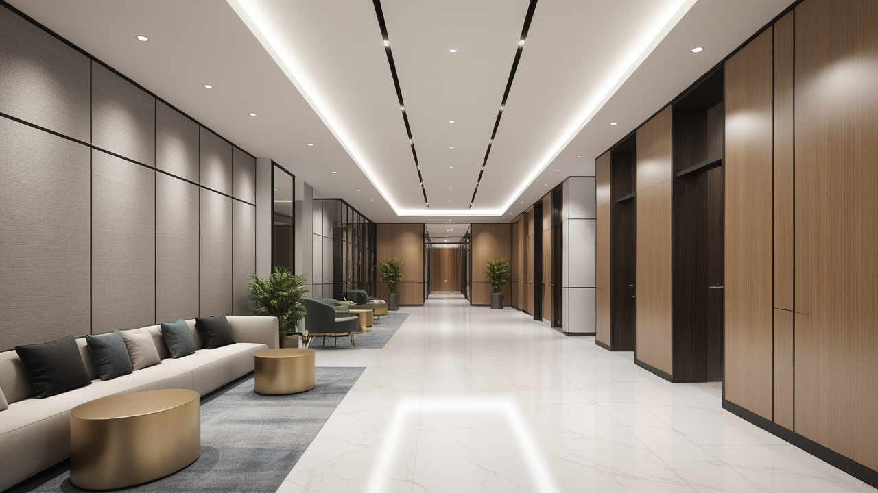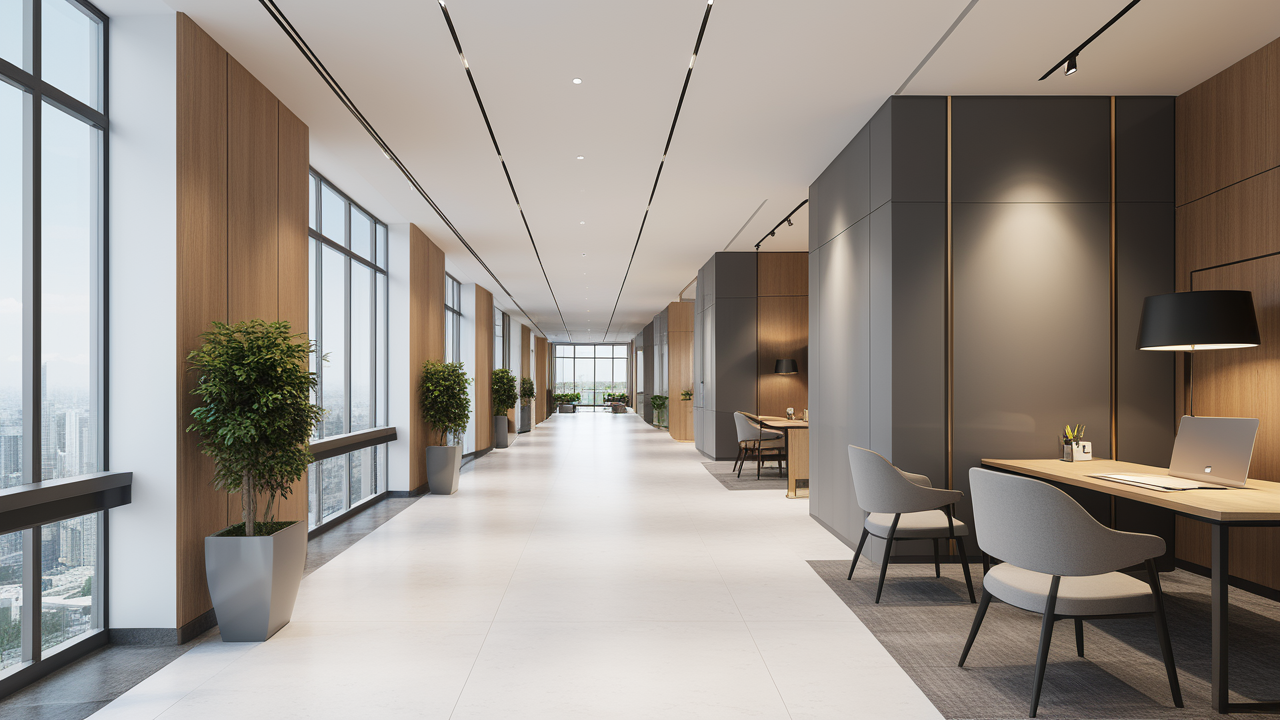 本案設計為突顯建筑開間較舒適之優(yōu)點,設計師特意設計了過道各柱體間鑲嵌不銹鋼條及玻璃幕墻上的磨砂條來點綴的裝修主題,同時,地面用拼花色帶打破,與方正而美觀的吊頂上下呼應;辦公室靠近走道的墻面,為將自然光透入走道,同時又加強其“靈透”感,采用清玻幕墻,幕墻上的磨砂條既打破了玻璃墻面的呆板,又提醒了行人幕墻的存在,防止無意識碰頭、沖撞等類似意外發(fā)生;為辦公室的后續(xù)私密性考慮,其清玻幕墻內(nèi)掛以百葉窗遮擋既可。