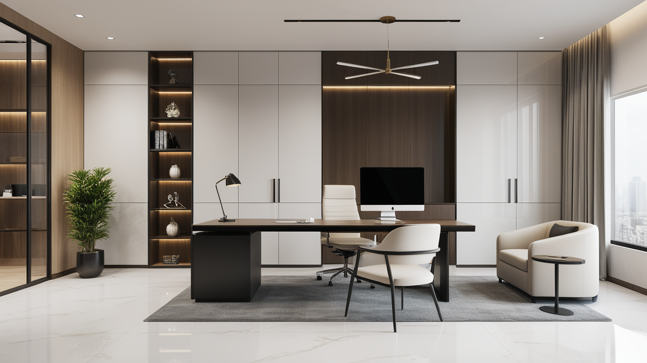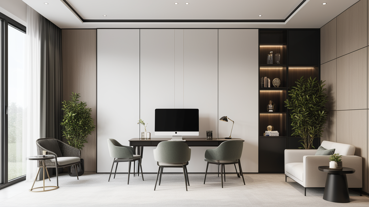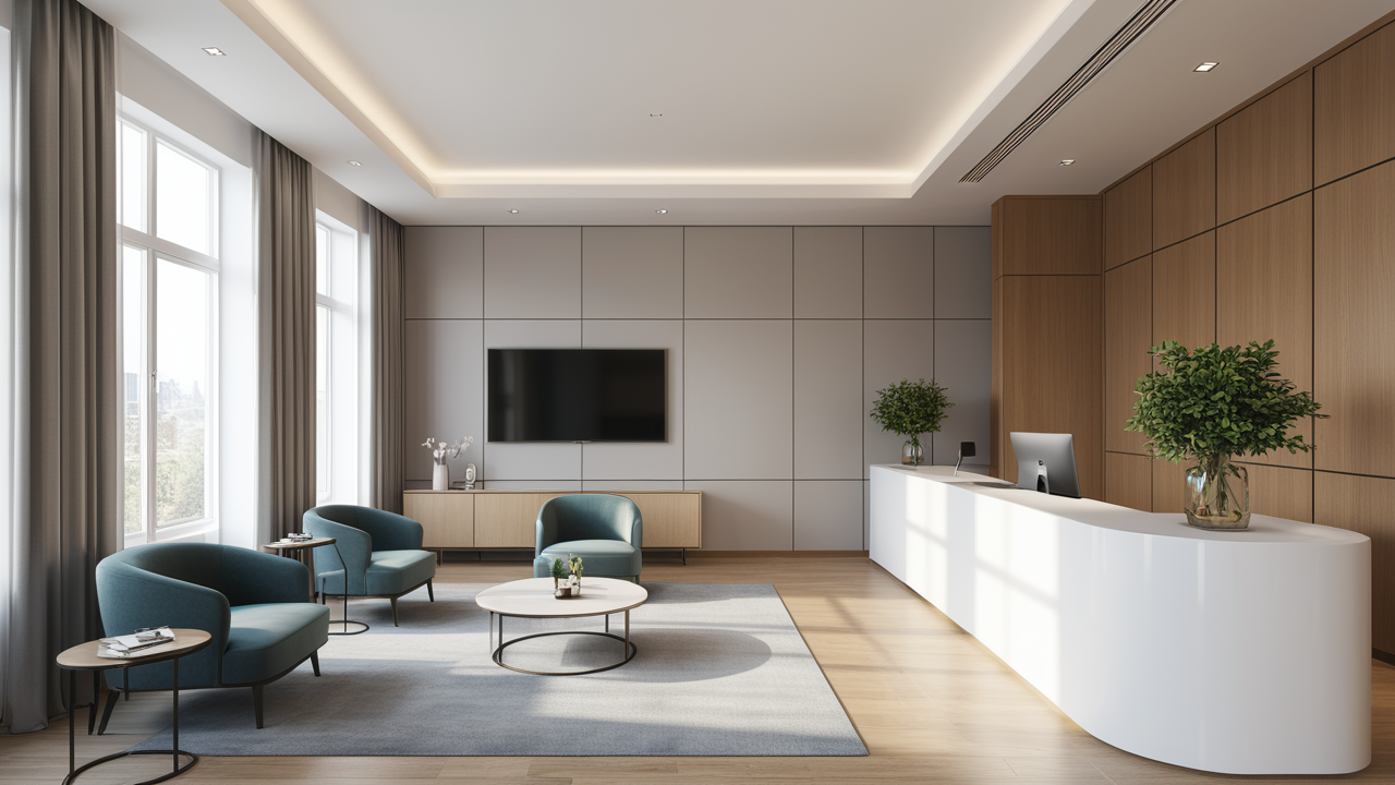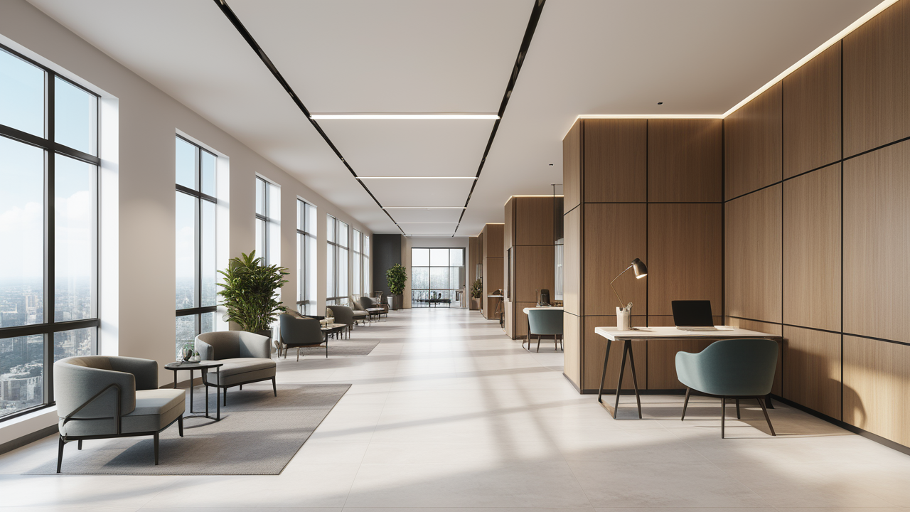 本案設計為突顯建筑開間較舒適之優(yōu)點,設計師特意設計了過道各柱體間鑲嵌不銹鋼條及玻璃幕墻上的磨砂條來點綴的裝修主題,同時,地面用拼花色帶打破,與方正而美觀的吊頂上下呼應;辦公室靠近走道的墻面,為將自然光透入走道,同時又加強其“靈透”感,采用清玻幕墻,幕墻上的磨砂條既打破了玻璃墻面的呆板,又提醒了行人幕墻的存在,防止無意識碰頭、沖撞等類似意外發(fā)生;為辦公室的后續(xù)私密性考慮,其清玻幕墻內(nèi)掛以百葉窗遮擋既可。