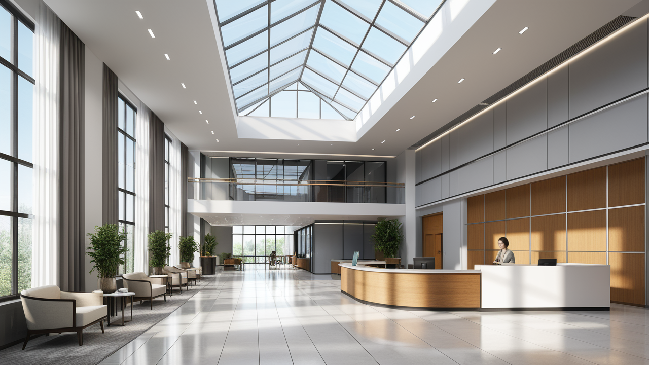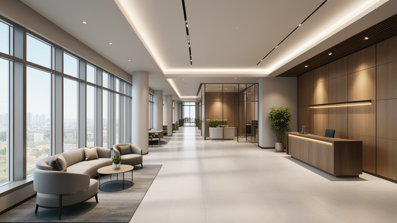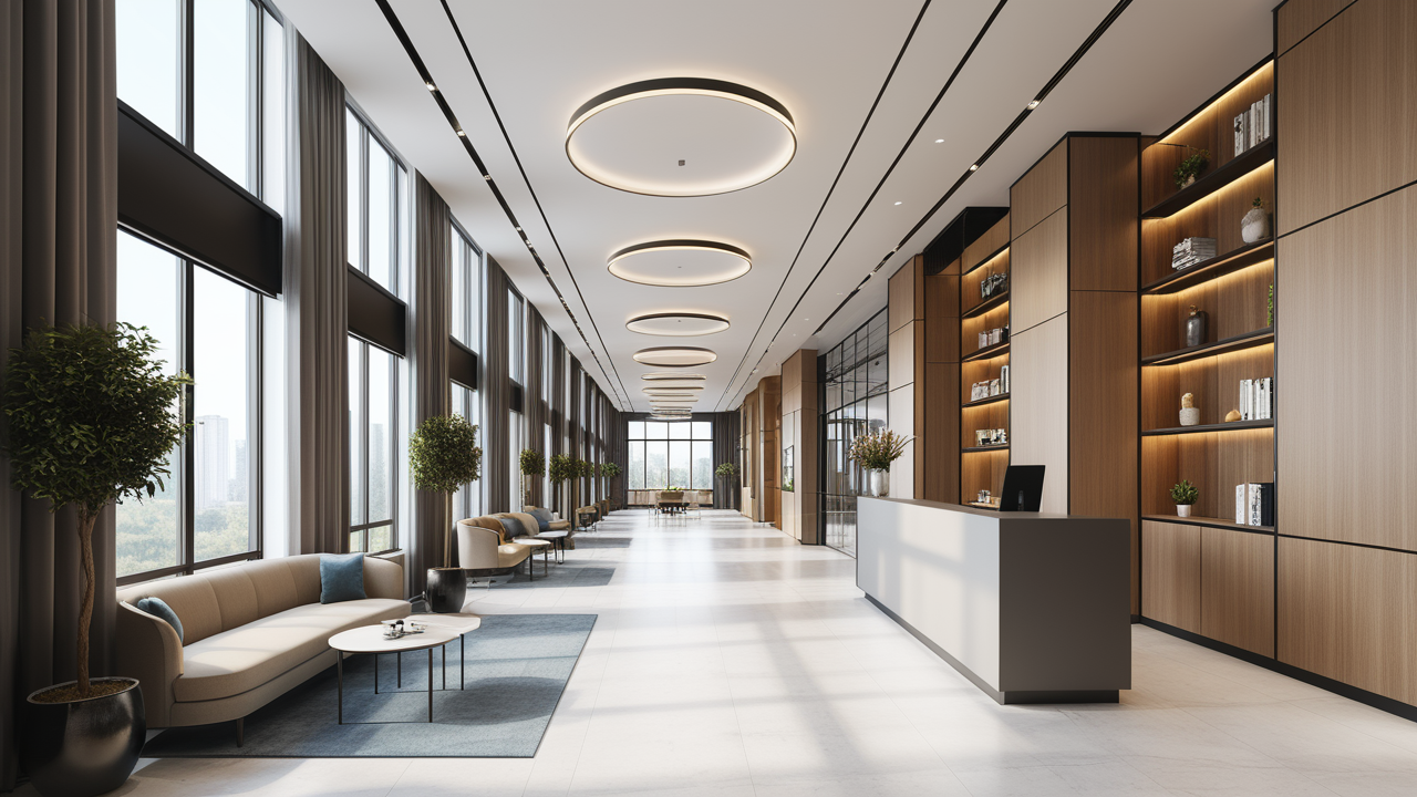 本案設計在處理上,特設計了可向客戶展示企業(yè)榮譽品的展示墻,用料實際,無須雕琢張揚,直線條的造型讓整個空間顯得穩(wěn)重大方,淺色系材料的運用延續(xù)了靈動而清澈的氣韻,大方莊重卻內(nèi)含現(xiàn)代時尚。而且色調(diào)淡雅的地毯、沙發(fā)、背景,還突出了接待廳親切、和睦、寬松的氛圍,使穩(wěn)靜而坦誠的晤談氣氛盎然一室。