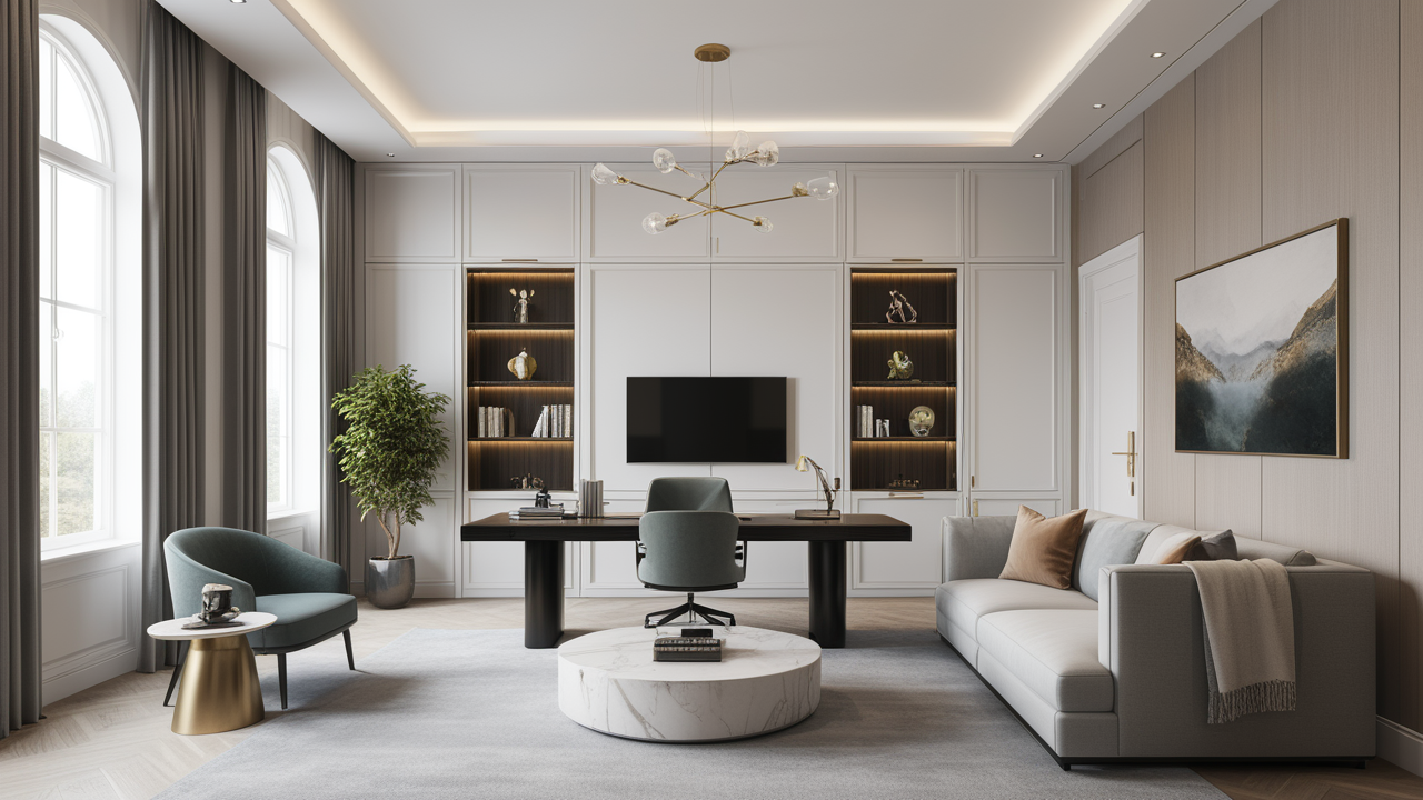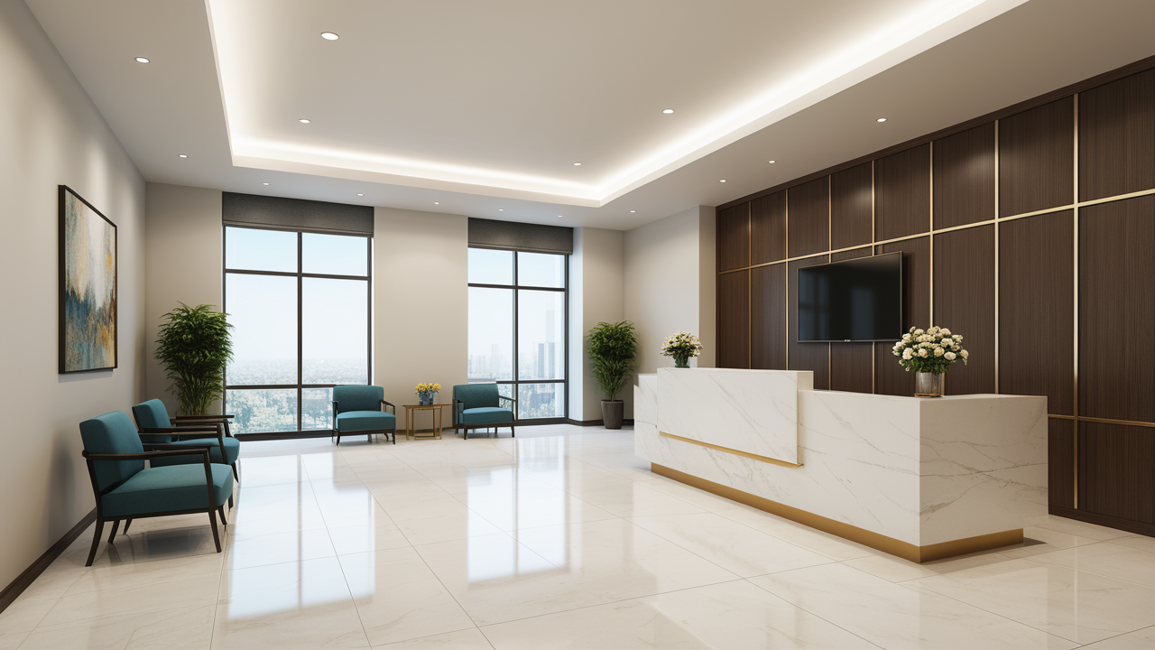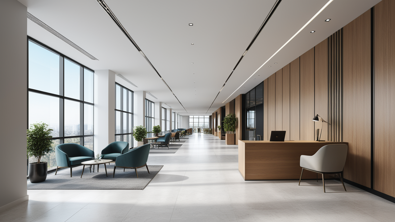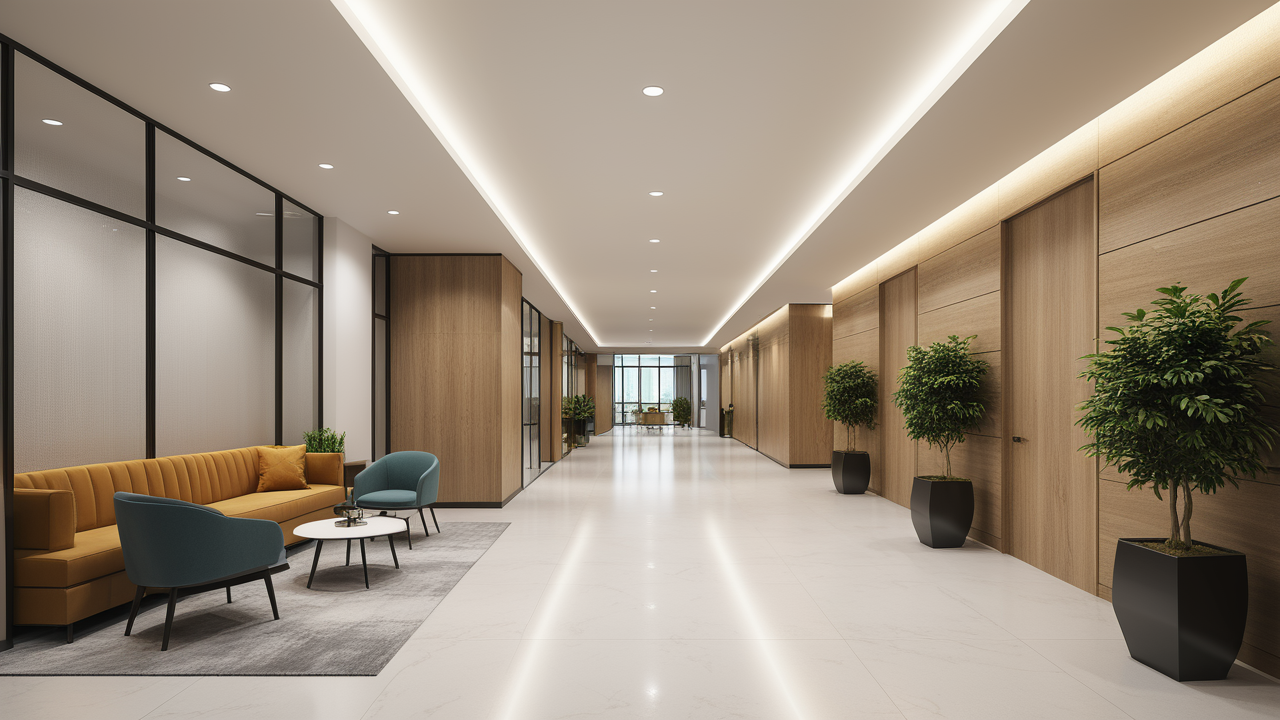 本案設計在處理上,特設計了可向客戶展示企業(yè)榮譽品的展示墻,用料實際,無須雕琢張揚,直線條的造型讓整個空間顯得穩(wěn)重大方,淺色系材料的運用延續(xù)了靈動而清澈的氣韻,大方莊重卻內(nèi)含現(xiàn)代時尚。而且色調(diào)淡雅的地毯、沙發(fā)、背景,還突出了接待廳親切、和睦、寬松的氛圍,使穩(wěn)靜而坦誠的晤談氣氛盎然一室。