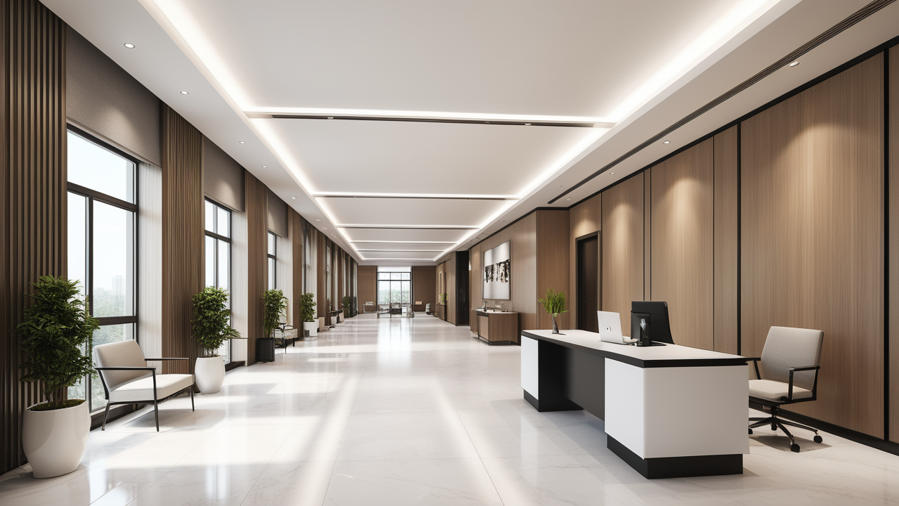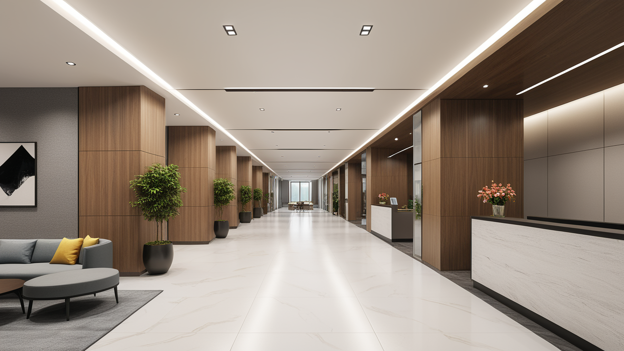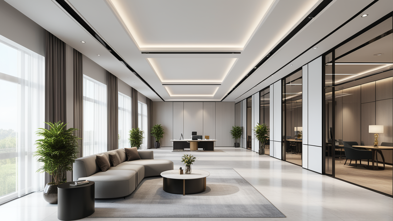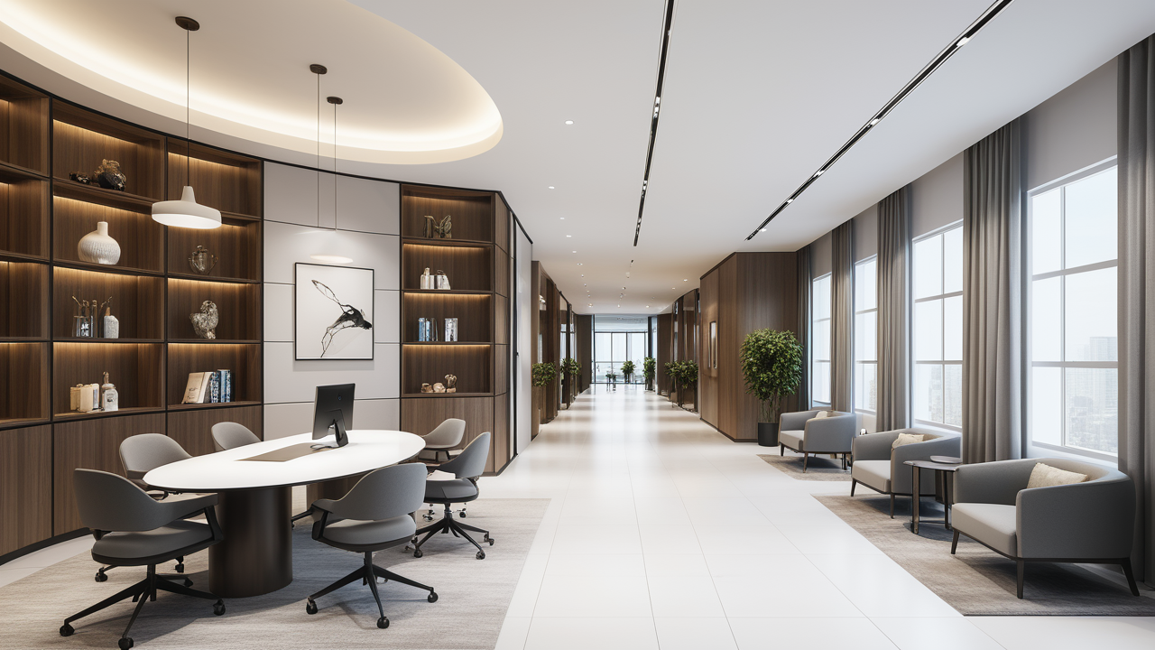 本案圍繞其“靈透”,大量使用了玻璃、銀色系列及淺色調(diào)的潔凈材料,如玻璃幕墻、銀質(zhì)鋁塑板、水晶白麻石材、玻化磚等,圍繞本案主題,構(gòu)筑個(gè)性化空間,該色彩搭配除了清透、雅致、穩(wěn)重、大氣之外,亦表現(xiàn)出一種力度感和效率感。滲透入貴機(jī)械制造企業(yè)之“清透感”,亦反襯企業(yè)之“柔美感”。以似乎矛盾的手法,又體現(xiàn)出古人之哲理“剛之極則柔,柔之極則剛”。老子說(shuō)“上善若水”,該案則就其“善”滲透到每一個(gè)空間,極盡讓每個(gè)功能區(qū)都具有清透之靈性,盡顯靈動(dòng)、清澈、時(shí)尚、大氣之空間氣韻。