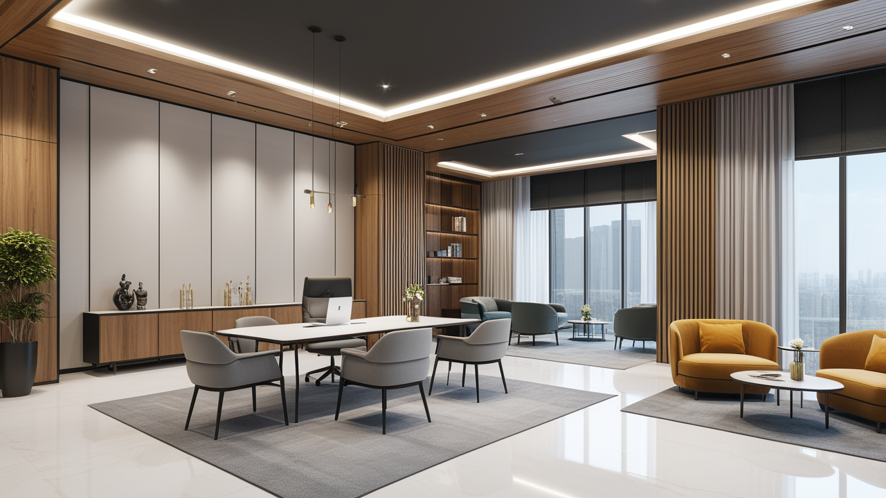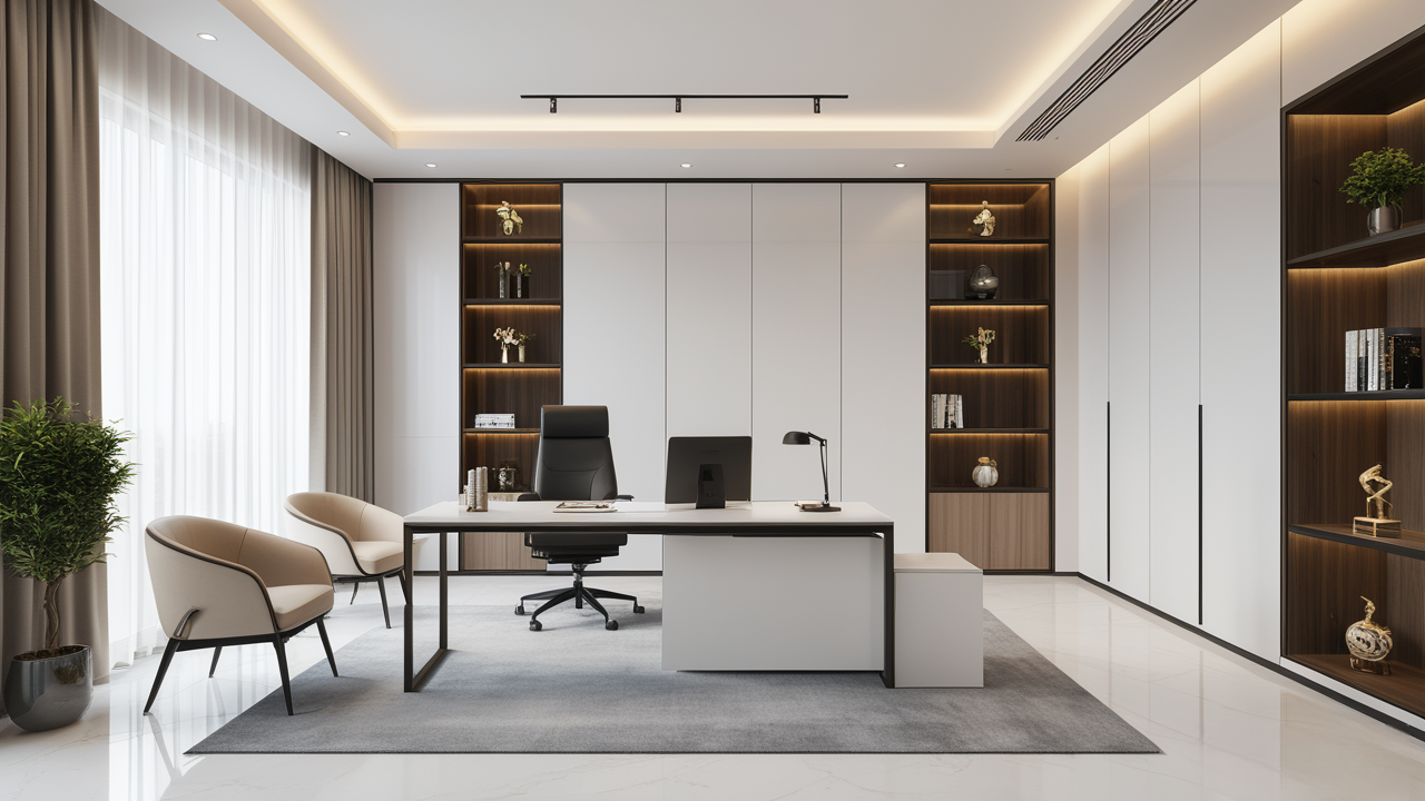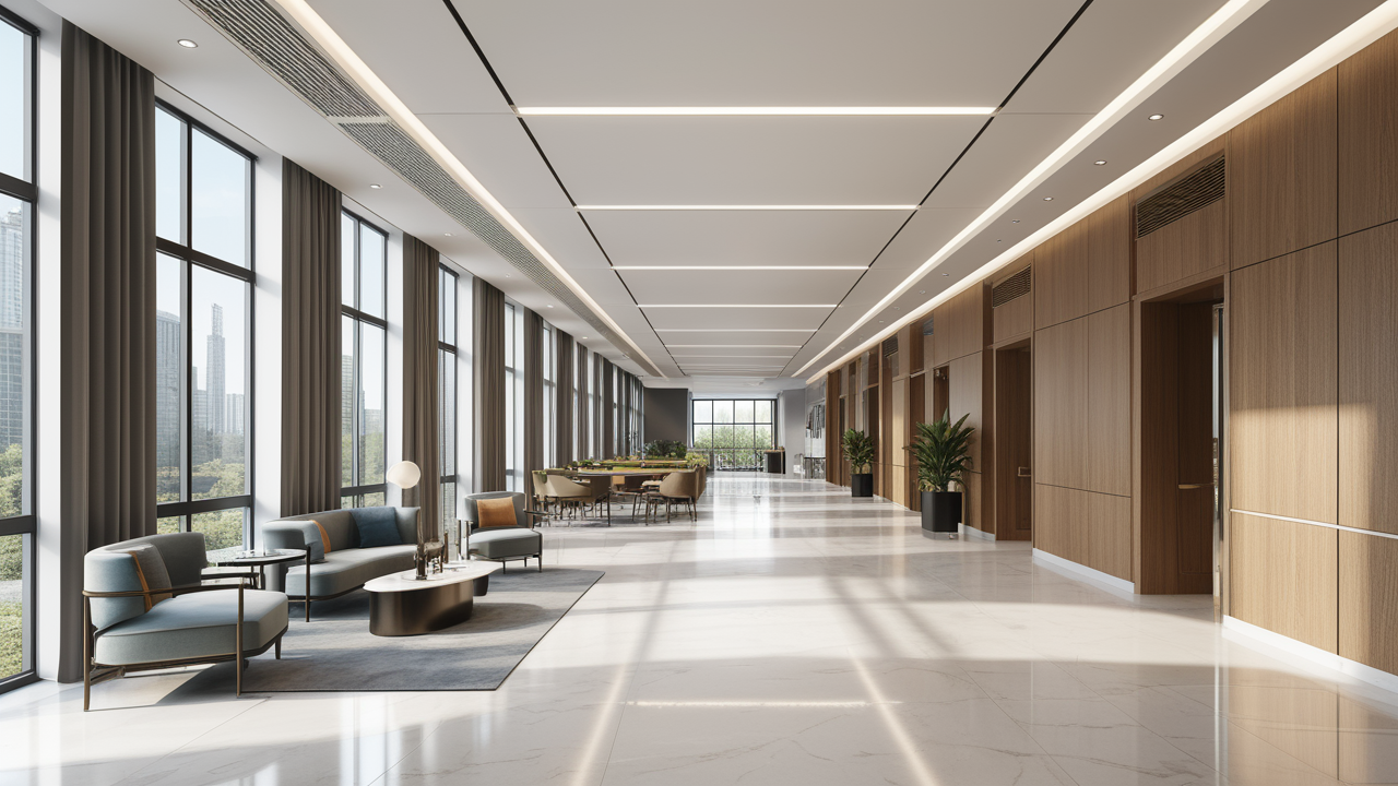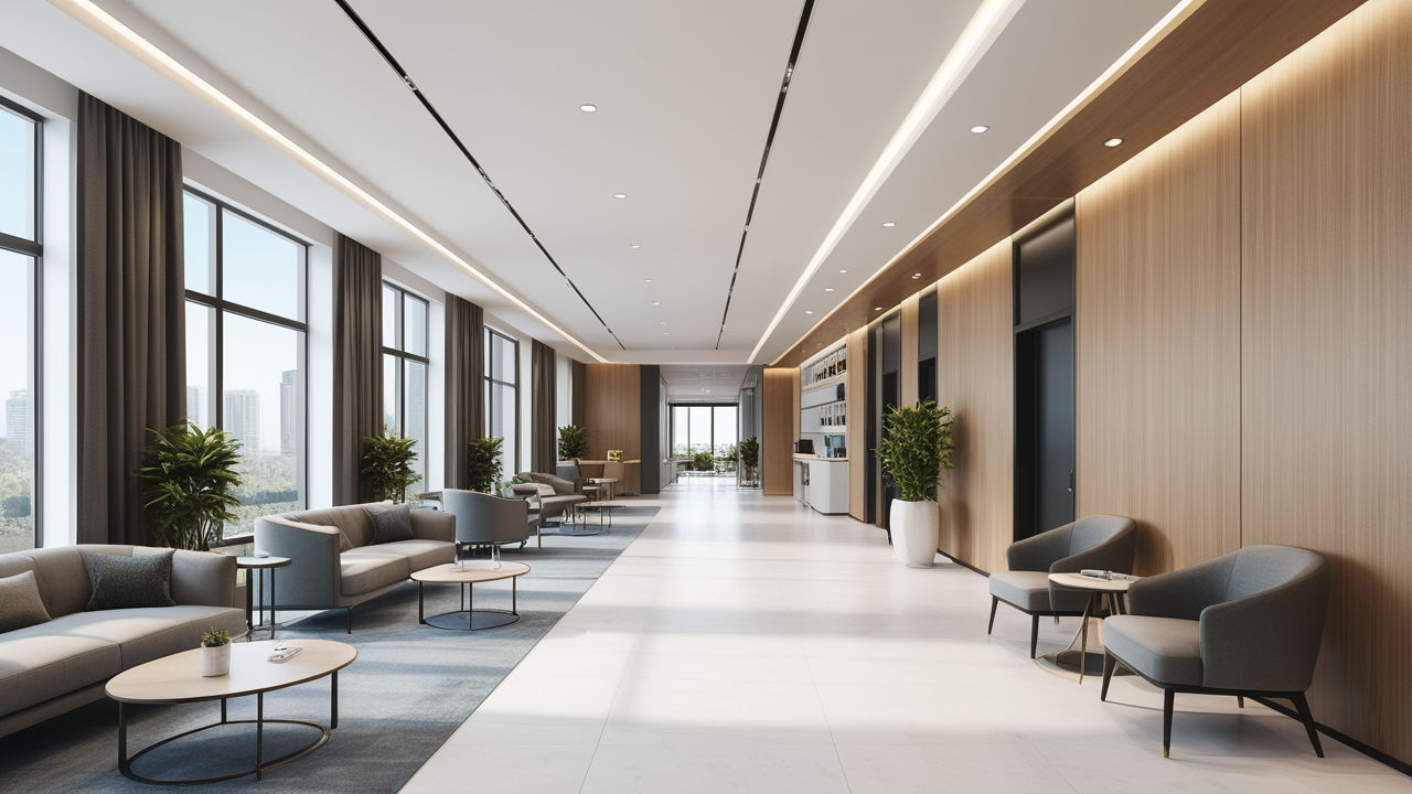本案圍繞其“靈透”,大量使用了玻璃、銀色系列及淺色調(diào)的潔凈材料,如玻璃幕墻、銀質(zhì)鋁塑板、水晶白麻石材、玻化磚等,圍繞本案主題,構(gòu)筑個(gè)性化空間,該色彩搭配除了清透、雅致、穩(wěn)重、大氣之外,亦表現(xiàn)出一種力度感和效率感。滲透入貴機(jī)械制造企業(yè)之“清透感”,亦反襯企業(yè)之“柔美感”。以似乎矛盾的手法,又體現(xiàn)出古人之哲理“剛之極則柔,柔之極則剛”。老子說(shuō)“上善若水”,該案則就其“善”滲透到每一個(gè)空間,極盡讓每個(gè)功能區(qū)都具有清透之靈性,盡顯靈動(dòng)、清澈、時(shí)尚、大氣之空間氣韻。