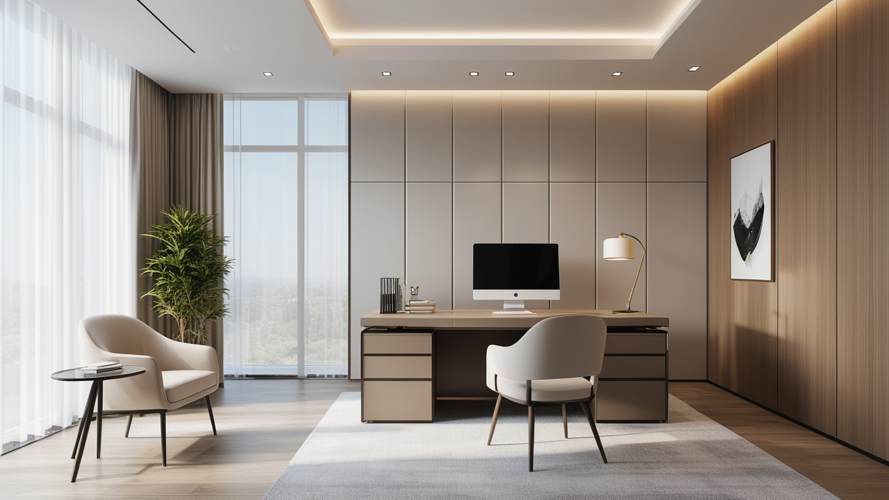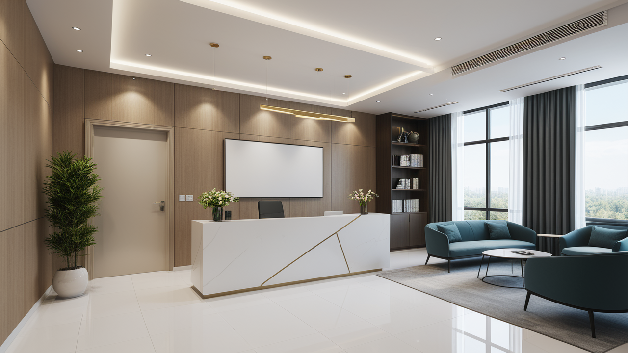 本案設(shè)計(jì)中企業(yè)形象墻,以其企業(yè)文化的新興、蓬勃、嚴(yán)謹(jǐn)為主題,兩側(cè)以“居有竹、步步高”的銀色墻柱帶來視覺沖擊感,加上企業(yè)形象色的類比色、淺色石材及不銹鋼條的運(yùn)用,顯示出金屬的質(zhì)感和工業(yè)文明的主題;然而休息區(qū)的陳設(shè)卻明麗蔥郁,充滿人文情感的自然氣息,恰恰彌補(bǔ)了視覺中的剛硬個(gè)冷竣,使人倍感親切。