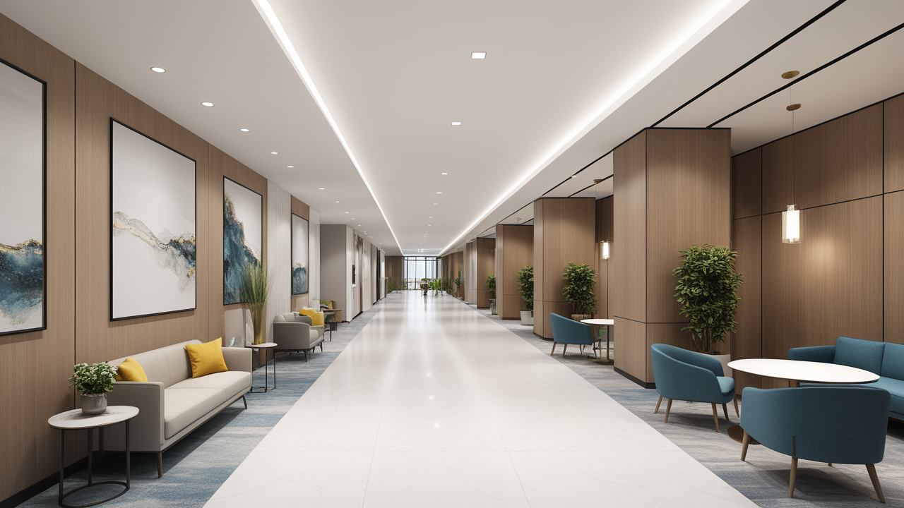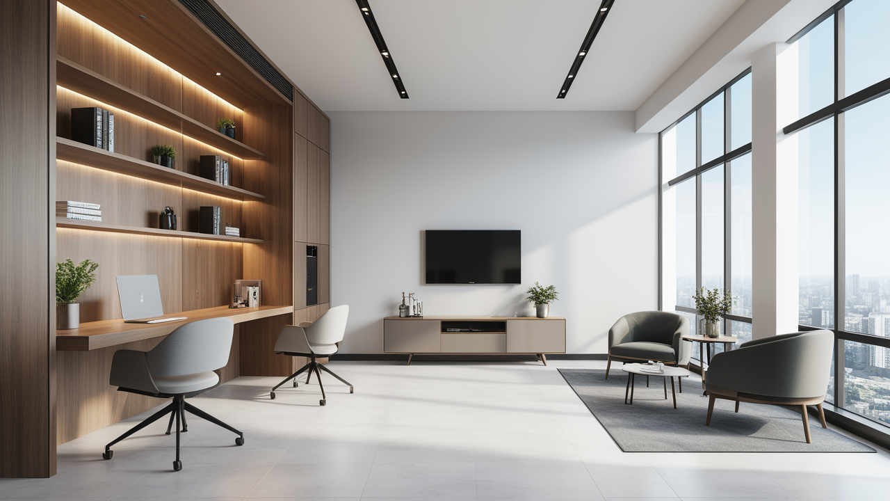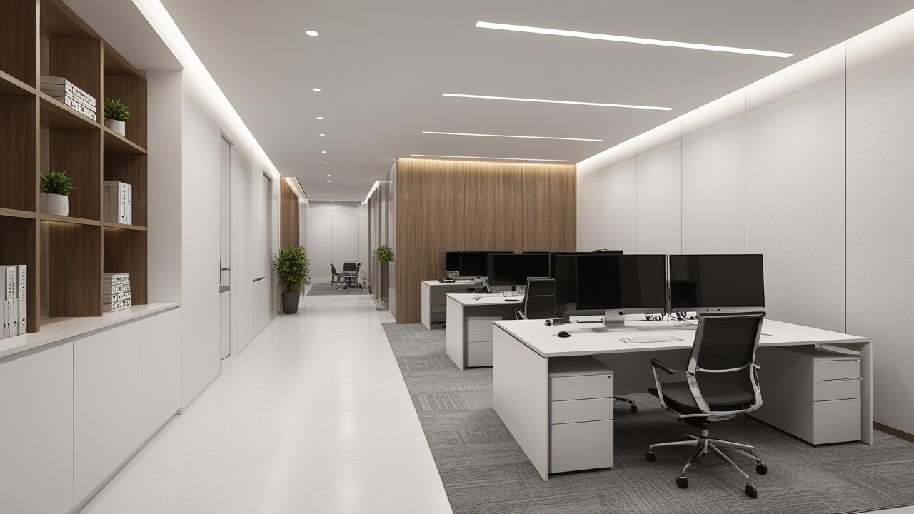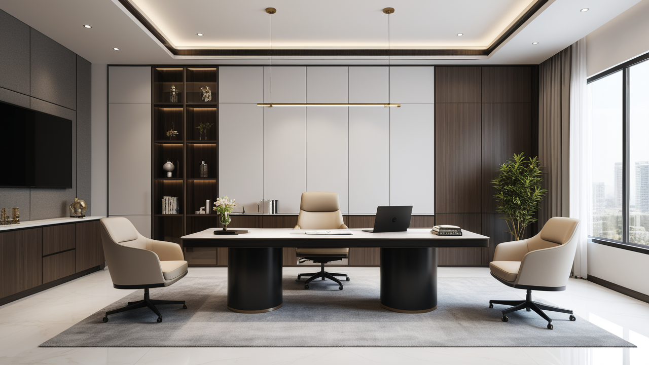 本案在這個辦公室設(shè)計中,甲方要求,有功能區(qū)設(shè)置,有總經(jīng)理,總經(jīng)理是本公司中最高的職務(wù),所以在我的設(shè)計中給他選擇了一個比較好的朝向,采光比較好、地面采用仿古顯紋復(fù)合強化淺色木地板。防滑耐磨。幾何式的辦公桌莊嚴(yán)不失人性化。自然的美巧妙的運用到設(shè)計之中,突顯對美好生活的向往。放松工作時的狀態(tài),副總經(jīng)理兩間,裝修風(fēng)格跟總經(jīng)理相符,比較統(tǒng)一。會議室,在平面功能上??紤]了合理的行動路線,東面墻對應(yīng)窗的位置設(shè)計了落地的玉砂玻璃隔墻,以滿足展示區(qū)的采光要求。