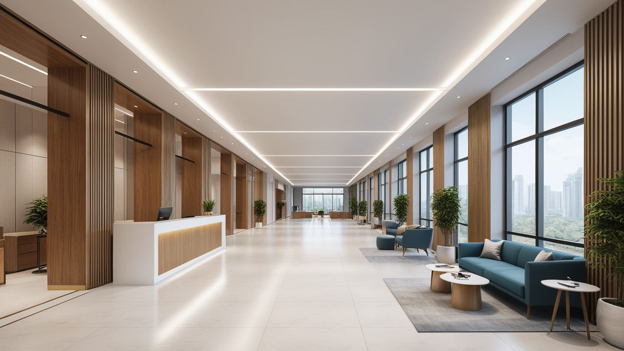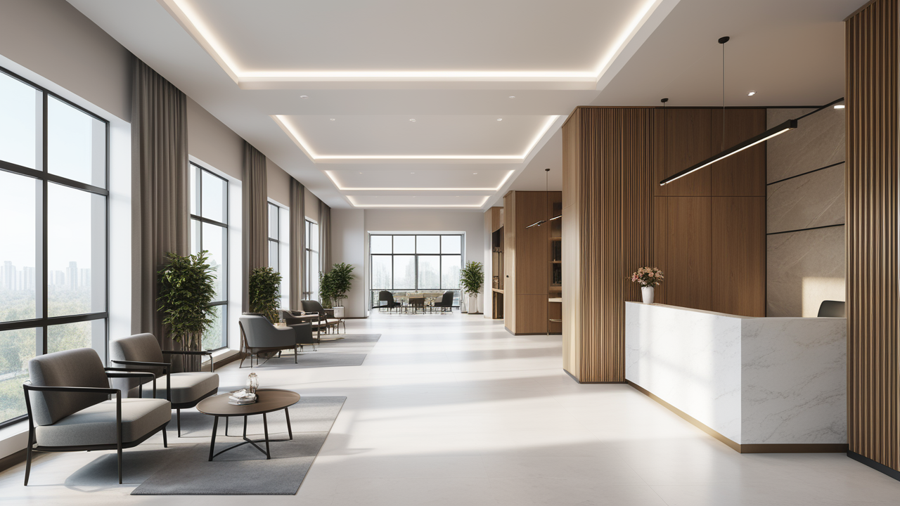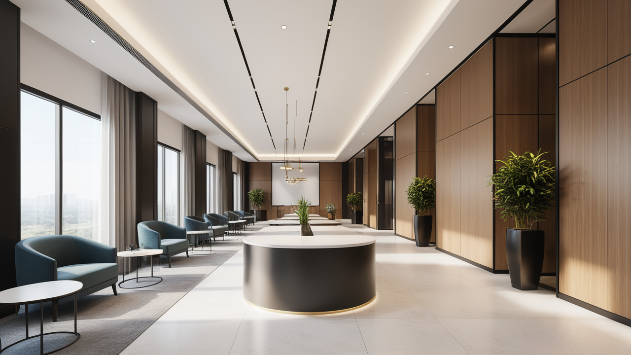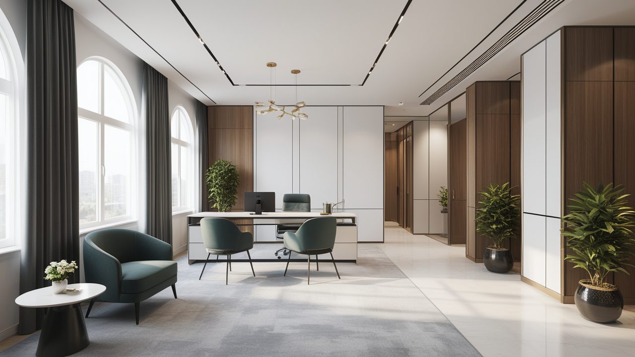 本案設(shè)計(jì)首先闖入眼簾的是企業(yè)形象墻,以其企業(yè)文化的新興、蓬勃、嚴(yán)謹(jǐn)為主題,兩側(cè)以“居有竹、步步高”的銀色墻柱帶來(lái)視覺(jué)沖擊感,加上企業(yè)形象色的類比色、淺色石材及不銹鋼條的運(yùn)用,顯示出金屬的質(zhì)感和工業(yè)文明的主題;華堂上方呼應(yīng)以直線為主調(diào)、大筆勾勒而出的時(shí)尚型弧面吊頂,大直大方顯示出強(qiáng)烈的縱深感,加之以清透、明媚的光色渲染,工整氣派、大家風(fēng)范,反襯出貴公司辦公樓的現(xiàn)代時(shí)尚特性,以干練快捷的設(shè)計(jì)節(jié)奏,展示出質(zhì)量與效率并舉的時(shí)代精神。