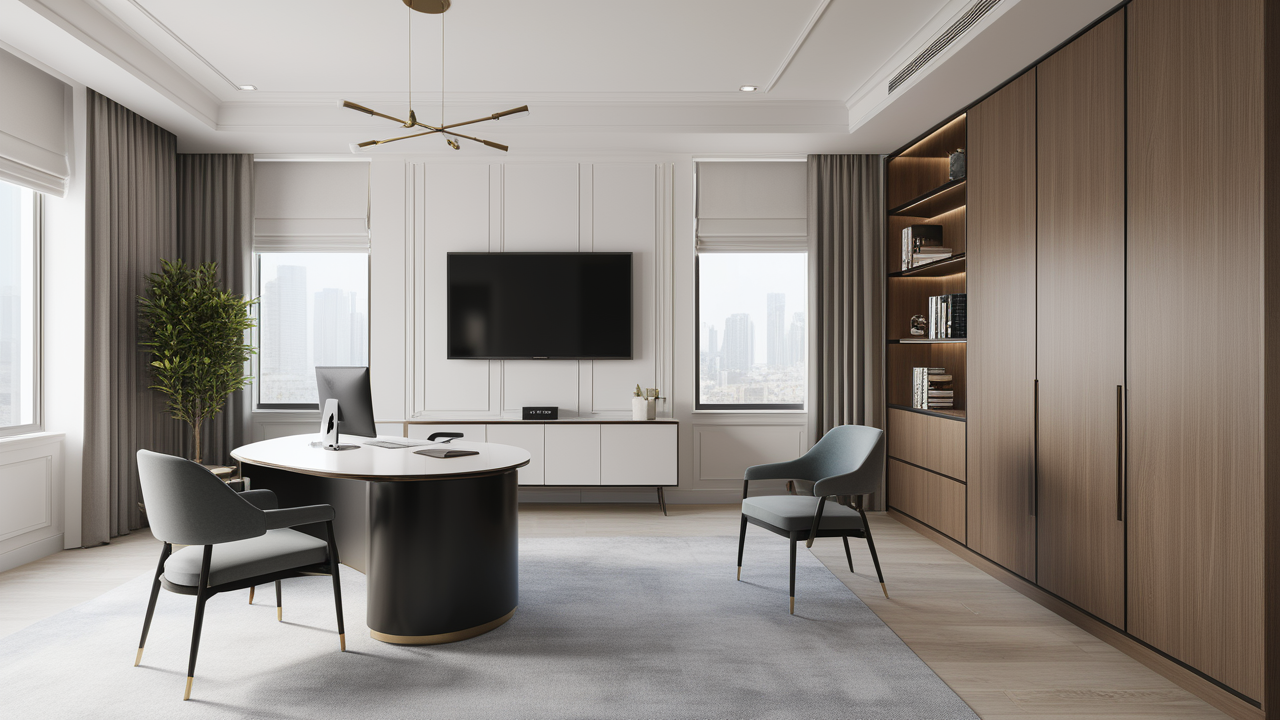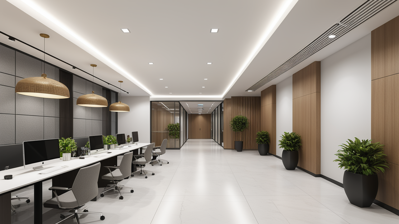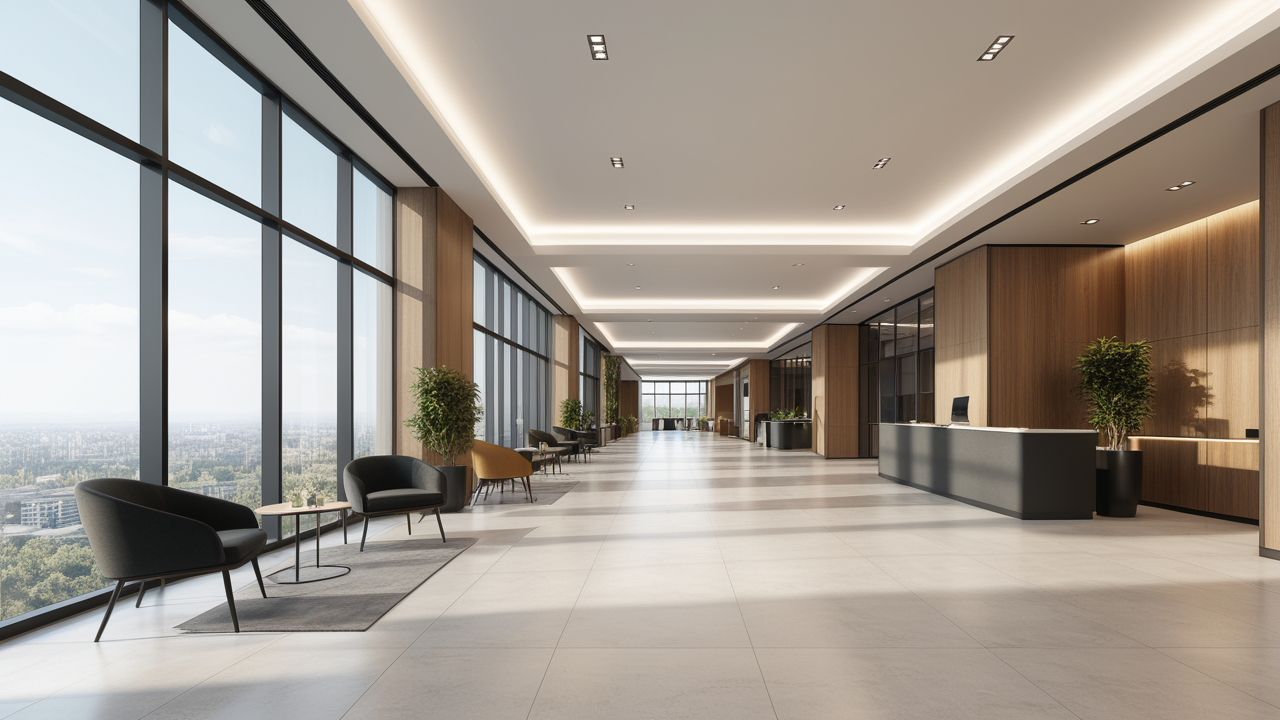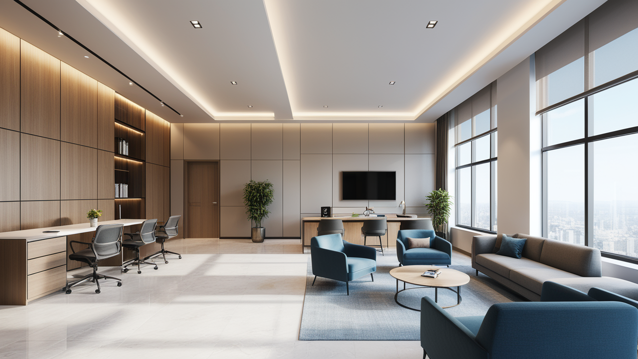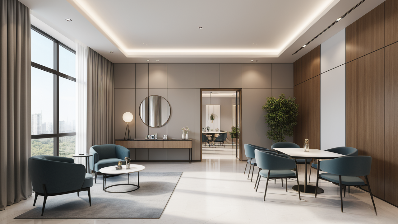 本案設(shè)計(jì)首先闖入眼簾的是企業(yè)形象墻,以其企業(yè)文化的新興、蓬勃、嚴(yán)謹(jǐn)為主題,兩側(cè)以“居有竹、步步高”的銀色墻柱帶來(lái)視覺(jué)沖擊感,加上企業(yè)形象色的類比色、淺色石材及不銹鋼條的運(yùn)用,顯示出金屬的質(zhì)感和工業(yè)文明的主題;華堂上方呼應(yīng)以直線為主調(diào)、大筆勾勒而出的時(shí)尚型弧面吊頂,大直大方顯示出強(qiáng)烈的縱深感,加之以清透、明媚的光色渲染,工整氣派、大家風(fēng)范,反襯出貴公司辦公樓的現(xiàn)代時(shí)尚特性,以干練快捷的設(shè)計(jì)節(jié)奏,展示出質(zhì)量與效率并舉的時(shí)代精神。