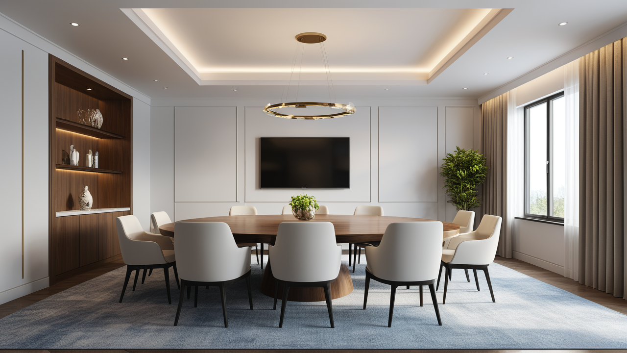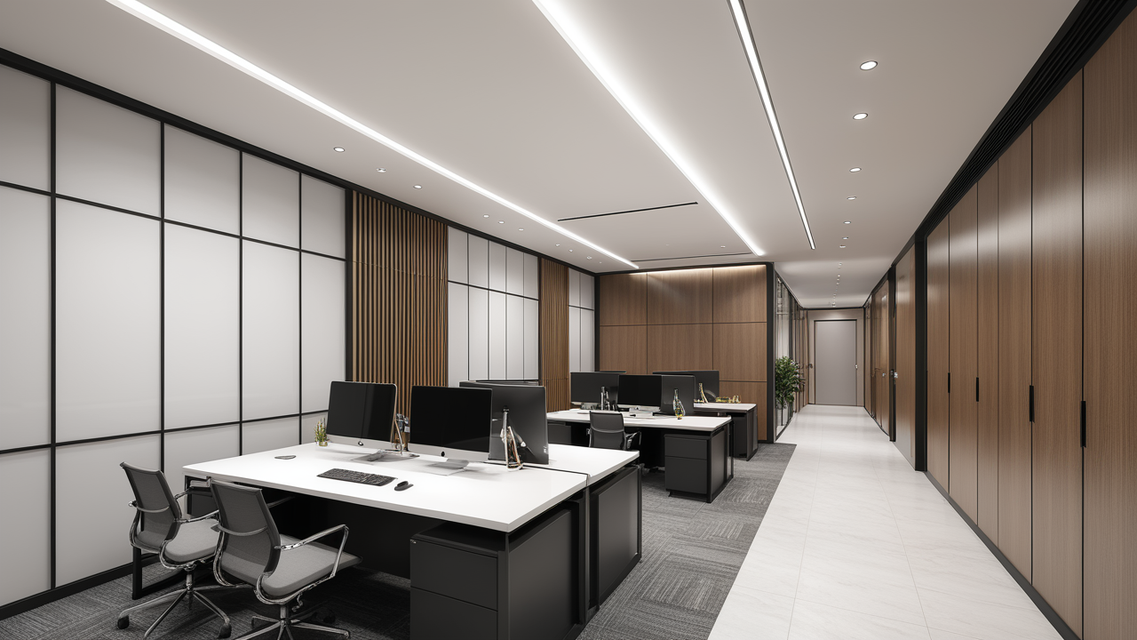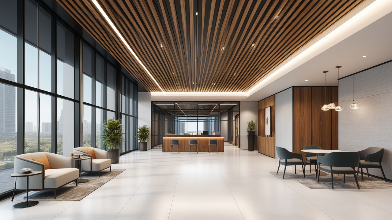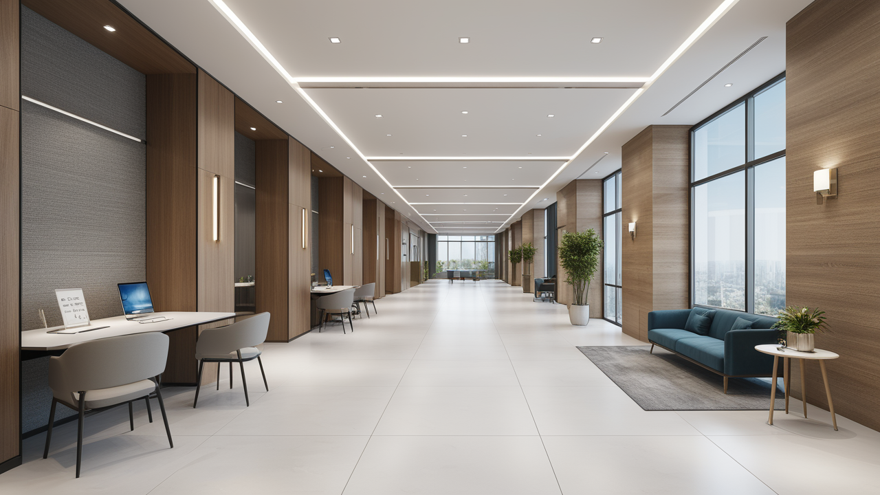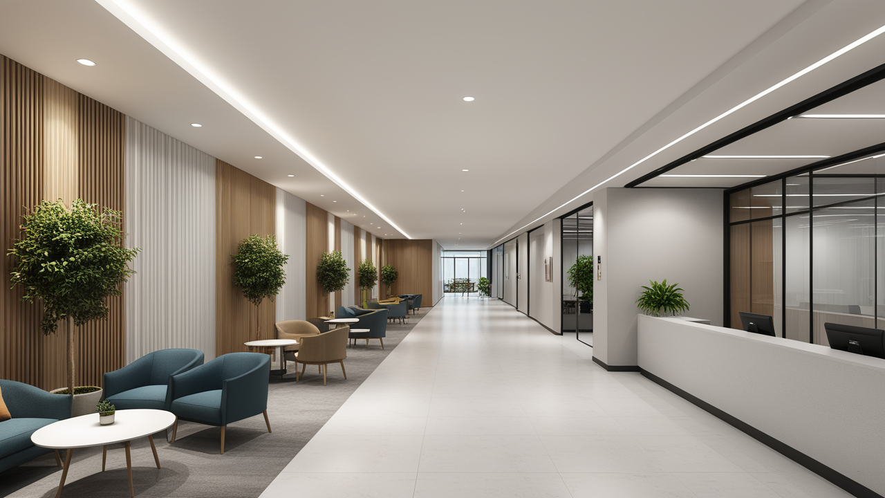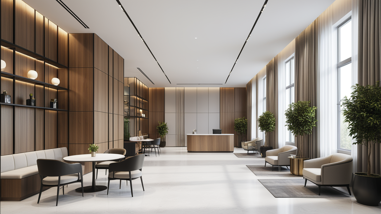 本案設(shè)計(jì)在處理上,特設(shè)計(jì)了可向客戶展示企業(yè)榮譽(yù)品的展示墻,用料實(shí)際,無須雕琢張揚(yáng),直線條的造型讓整個空間顯得穩(wěn)重大方,淺色系材料的運(yùn)用延續(xù)了靈動而清澈的氣韻,大方莊重卻內(nèi)含現(xiàn)代時尚。而且色調(diào)淡雅的地毯、沙發(fā)、背景,還突出了接待廳親切、和睦、寬松的氛圍,使穩(wěn)靜而坦誠的晤談氣氛盎然一室。