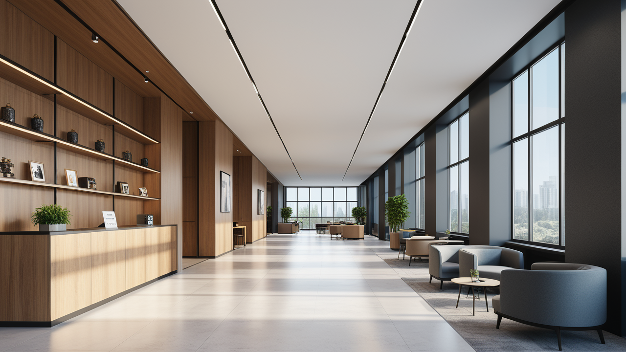 本案圍繞其“靈透”,大量使用了玻璃、銀色系列及淺色調(diào)的潔凈材料,如玻璃幕墻、銀質(zhì)鋁塑板、水晶白麻石材、?;u等,圍繞本案主題,構(gòu)筑個性化空間,該色彩搭配除了清透、雅致、穩(wěn)重、大氣之外,亦表現(xiàn)出一種力度感和效率感。滲透入貴機械制造企業(yè)之“清透感”,亦反襯企業(yè)之“柔美感”。以似乎矛盾的手法,又體現(xiàn)出古人之哲理“剛之極則柔,柔之極則剛”。老子說“上善若水”,該案則就其“善”滲透到每一個空間,極盡讓每個功能區(qū)都具有清透之靈性,盡顯靈動、清澈、時尚、大氣之空間氣韻。