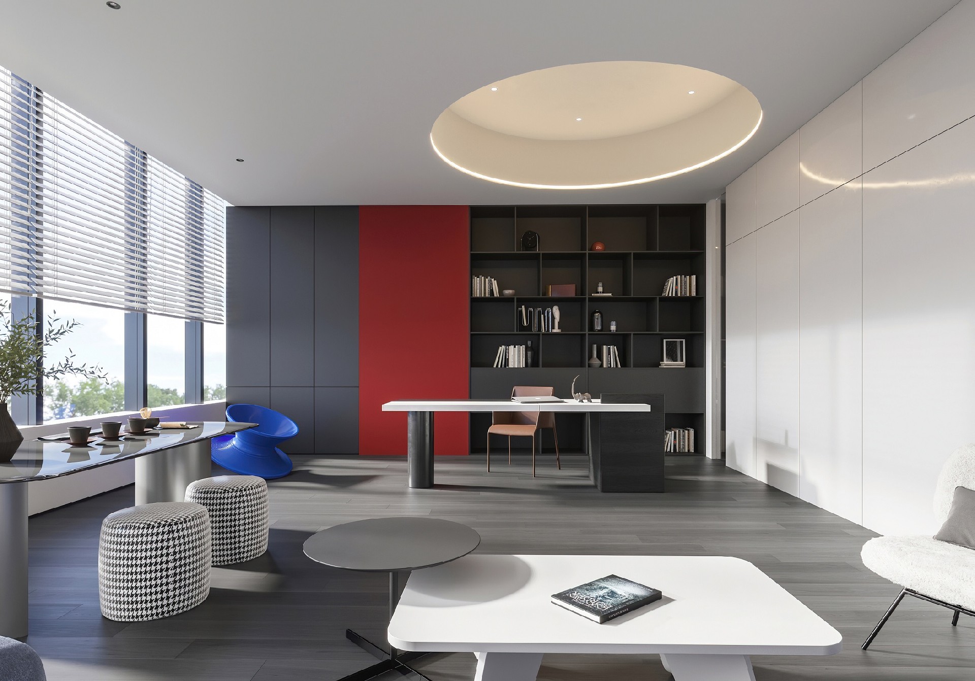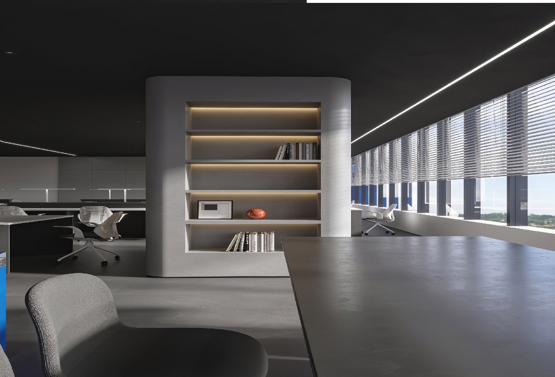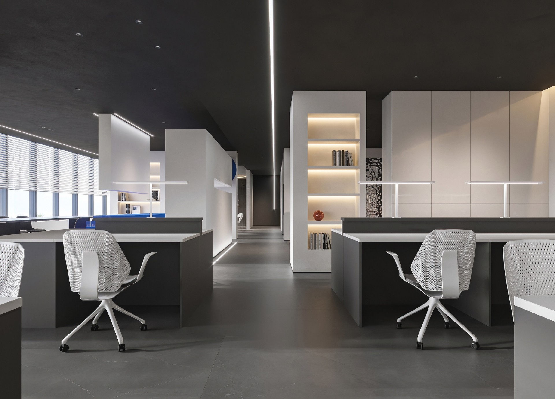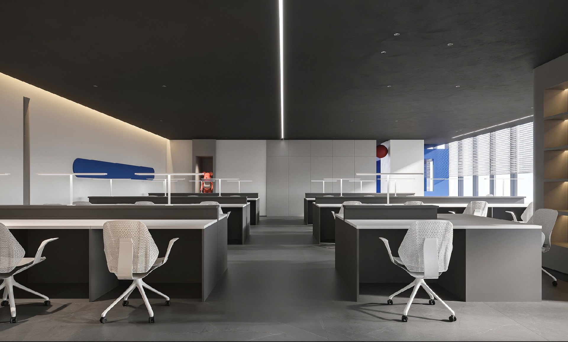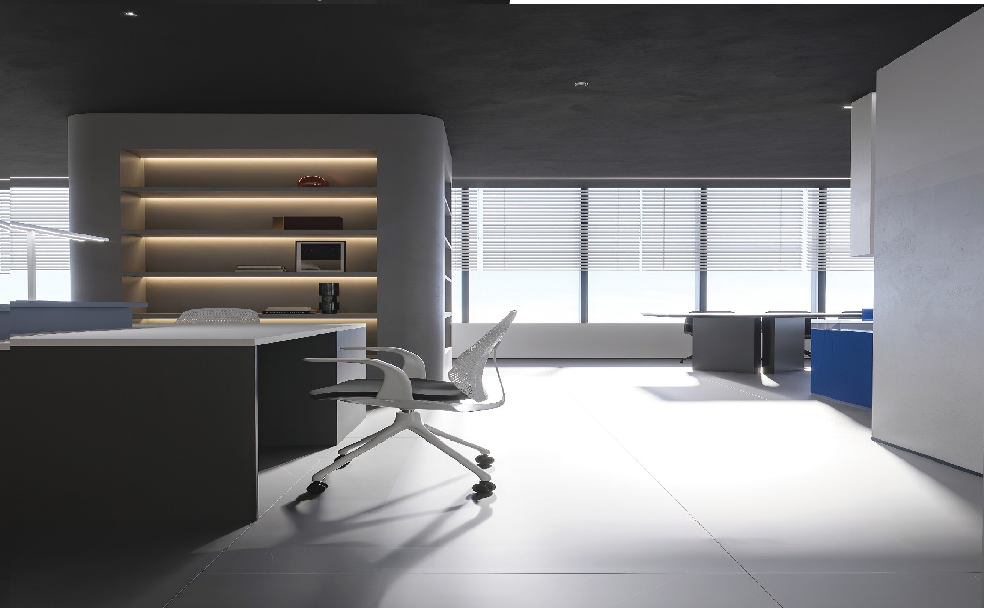 本案屬于簡約的風格,簡單而有品位,色調(diào)冷暖結(jié)合。辦公環(huán)境的風格取向、舒適與否對于提升員工的工作效率和體現(xiàn)企業(yè)文化起到至關(guān)重要的作用。辦公室整體色調(diào)采用藍灰調(diào),使員工辦公的心情能夠沉靜下來,工作效率自然可以得到提高。有一位建筑大師曾說過:“當綠化、光和風根據(jù)人的意念從原先自然中抽象出來,它們就趨向天堂”。我們在室內(nèi)引入天光設(shè)置了自然植物,將室外的感覺引入室內(nèi)空間,使辦公環(huán)境更具活力。