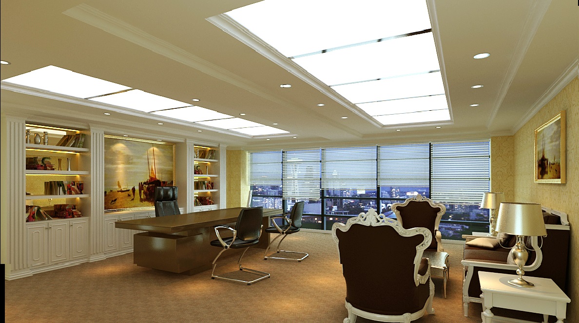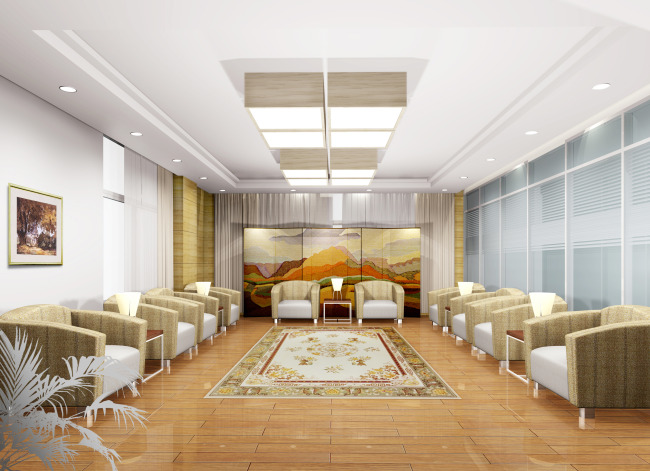 本案設(shè)計(jì)為突顯建筑開間較舒適之優(yōu)點(diǎn),設(shè)計(jì)師特意設(shè)計(jì)了過道各柱體間鑲嵌不銹鋼條及玻璃幕墻上的磨砂條來點(diǎn)綴的裝修主題,同時(shí),地面用拼花色帶打破,與方正而美觀的吊頂上下呼應(yīng);辦公室靠近走道的墻面,為將自然光透入走道,同時(shí)又加強(qiáng)其“靈透”感,采用清玻幕墻,幕墻上的磨砂條既打破了玻璃墻面的呆板,又提醒了行人幕墻的存在,防止無意識碰頭、沖撞等類似意外發(fā)生;為辦公室的后續(xù)私密性考慮,其清玻幕墻內(nèi)掛以百葉窗遮擋既可。