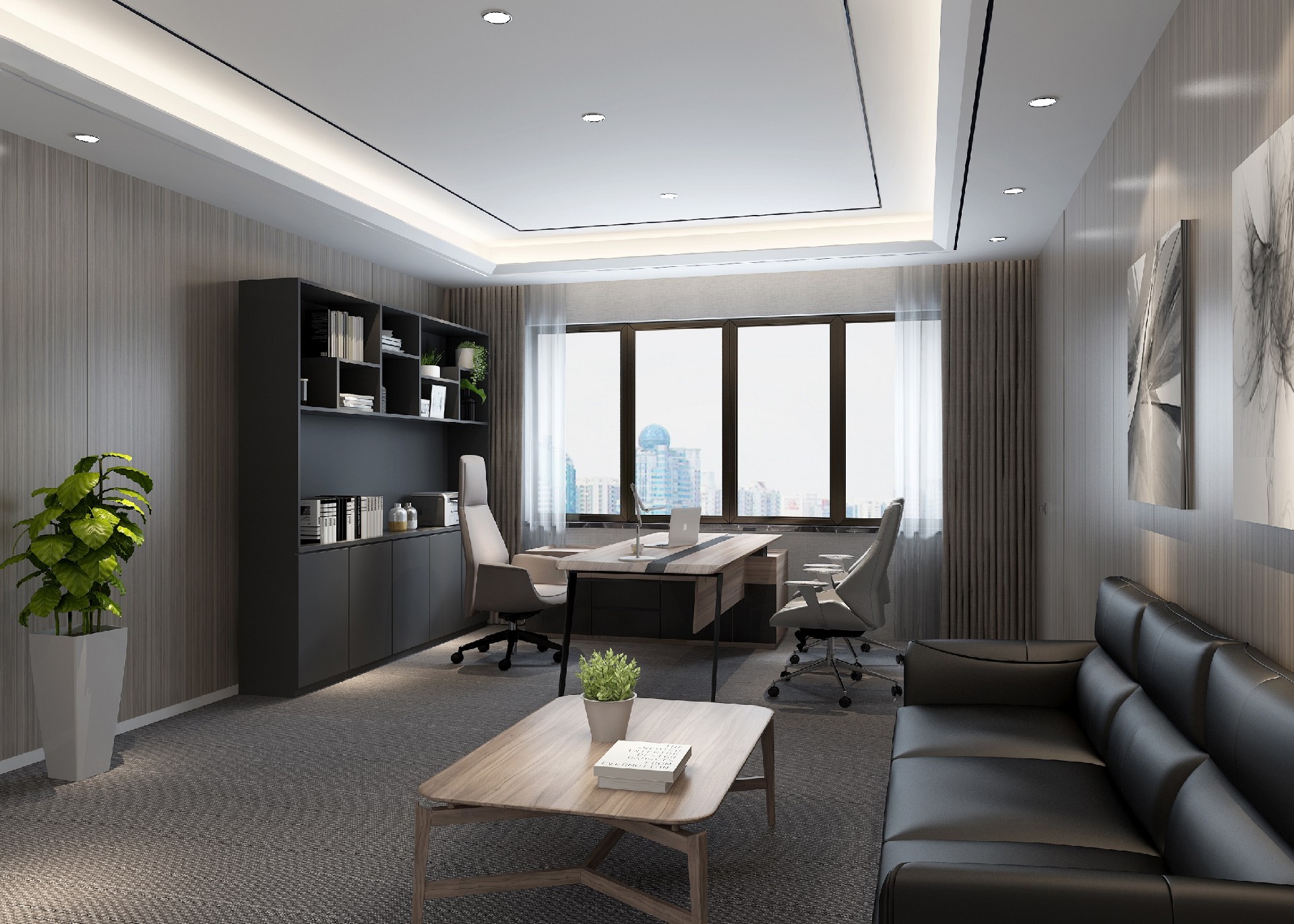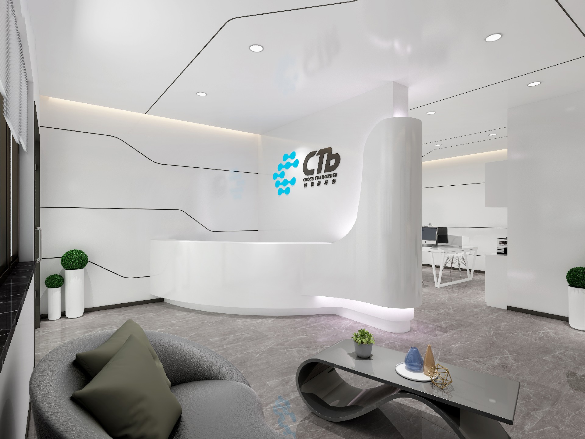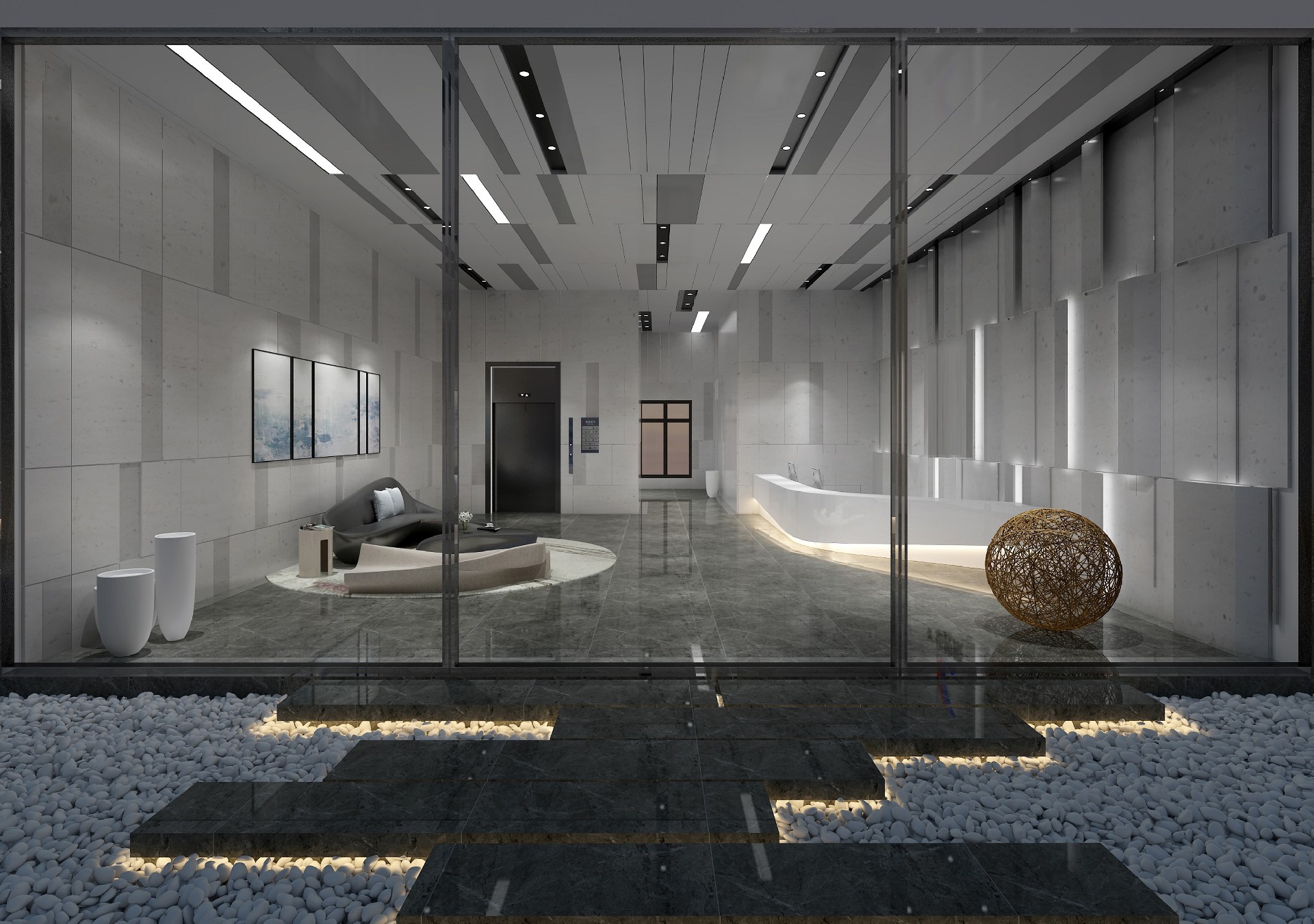 本案設(shè)計(jì)中企業(yè)形象墻,以其企業(yè)文化的新興、蓬勃、嚴(yán)謹(jǐn)為主題,兩側(cè)以“居有竹、步步高”的銀色墻柱帶來視覺沖擊感,加上企業(yè)形象色的類比色、淺色石材及不銹鋼條的運(yùn)用,顯示出金屬的質(zhì)感和工業(yè)文明的主題;然而休息區(qū)的陳設(shè)卻明麗蔥郁,充滿人文情感的自然氣息,恰恰彌補(bǔ)了視覺中的剛硬個(gè)冷竣,使人倍感親切。