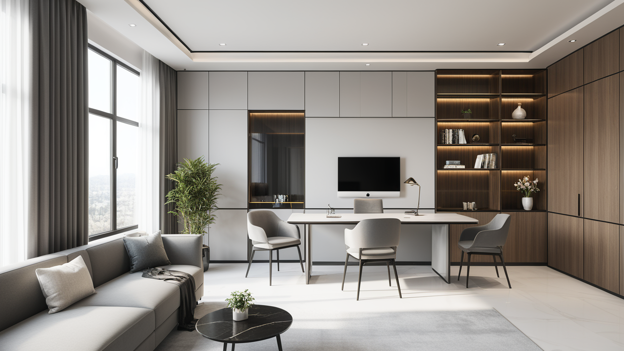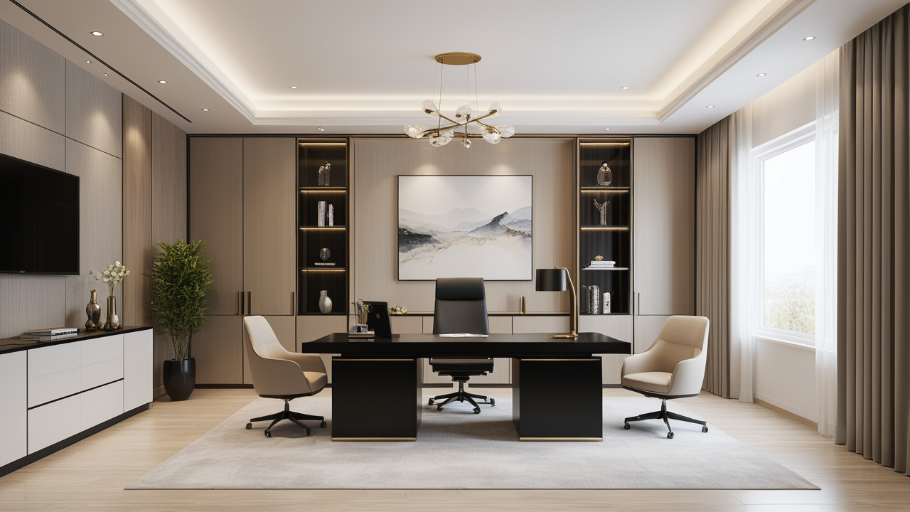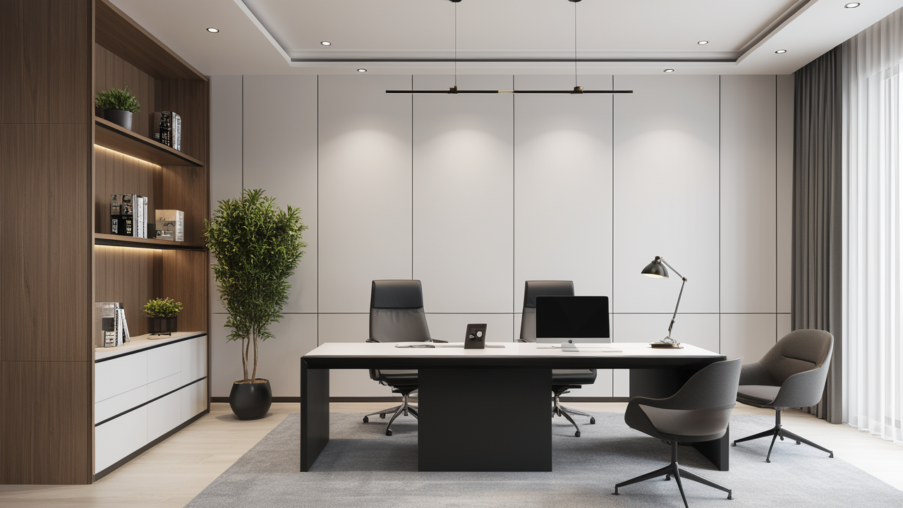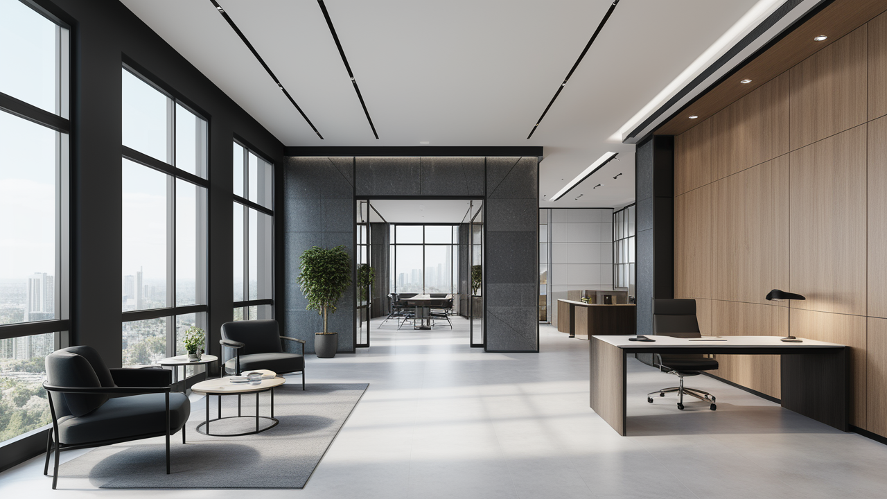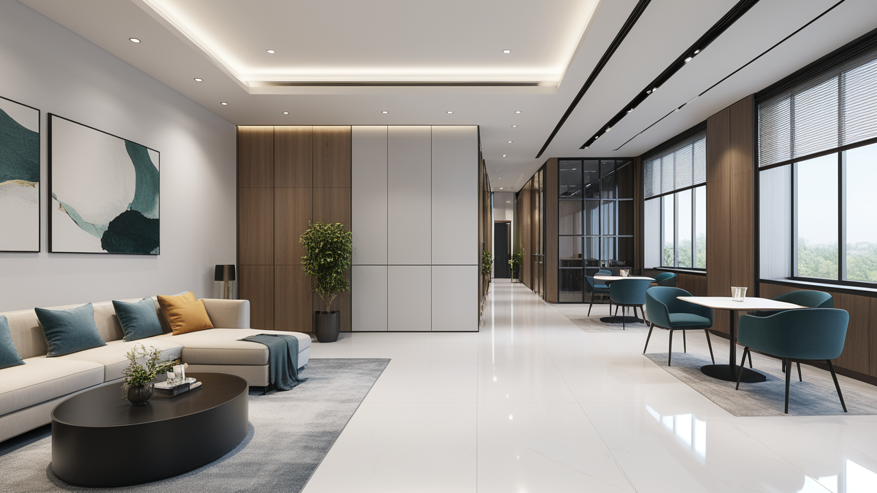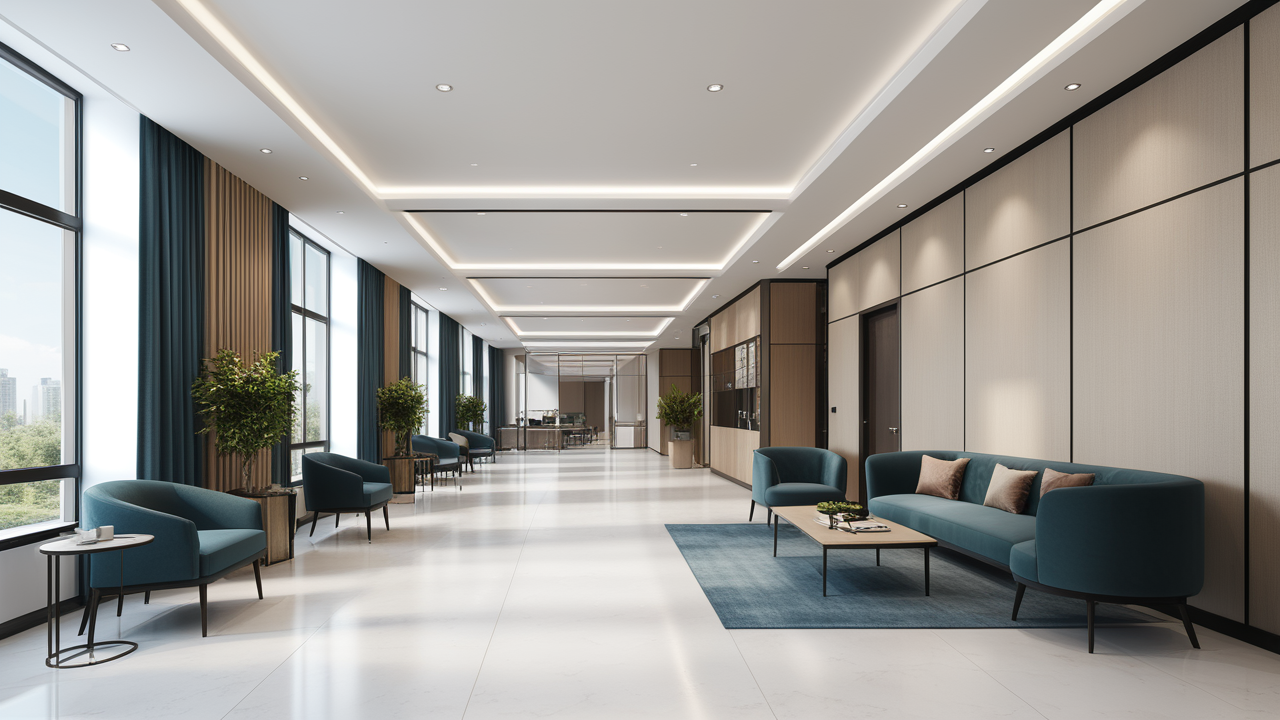 本案設(shè)計(jì)為突顯建筑開間較舒適之優(yōu)點(diǎn),設(shè)計(jì)師特意設(shè)計(jì)了過道各柱體間鑲嵌不銹鋼條及玻璃幕墻上的磨砂條來點(diǎn)綴的裝修主題,同時(shí),地面用拼花色帶打破,與方正而美觀的吊頂上下呼應(yīng);辦公室靠近走道的墻面,為將自然光透入走道,同時(shí)又加強(qiáng)其“靈透”感,采用清玻幕墻,幕墻上的磨砂條既打破了玻璃墻面的呆板,又提醒了行人幕墻的存在,防止無意識(shí)碰頭、沖撞等類似意外發(fā)生;為辦公室的后續(xù)私密性考慮,其清玻幕墻內(nèi)掛以百葉窗遮擋既可。