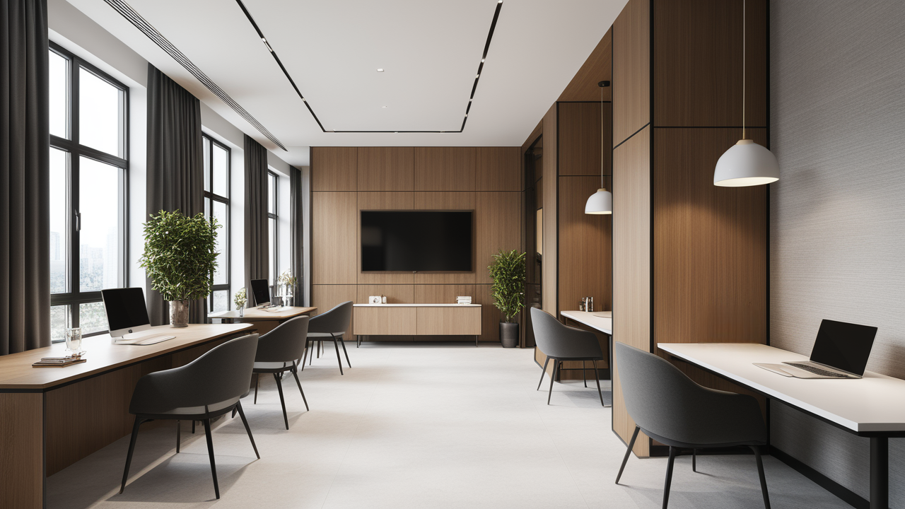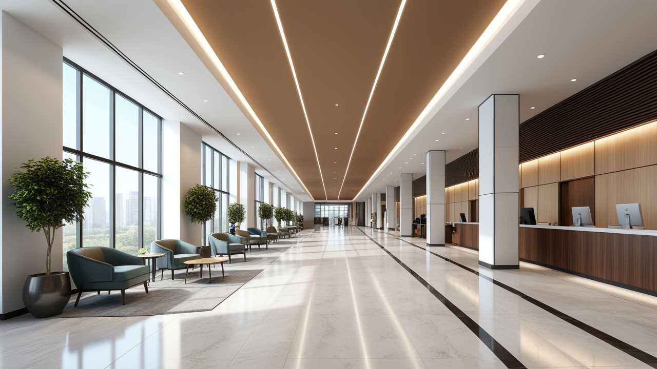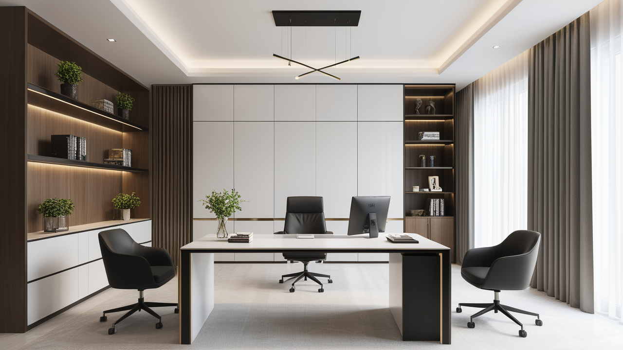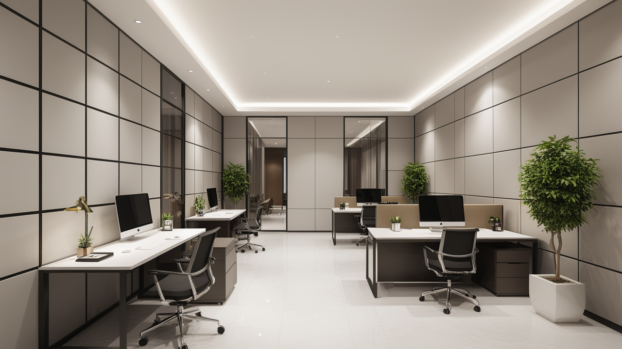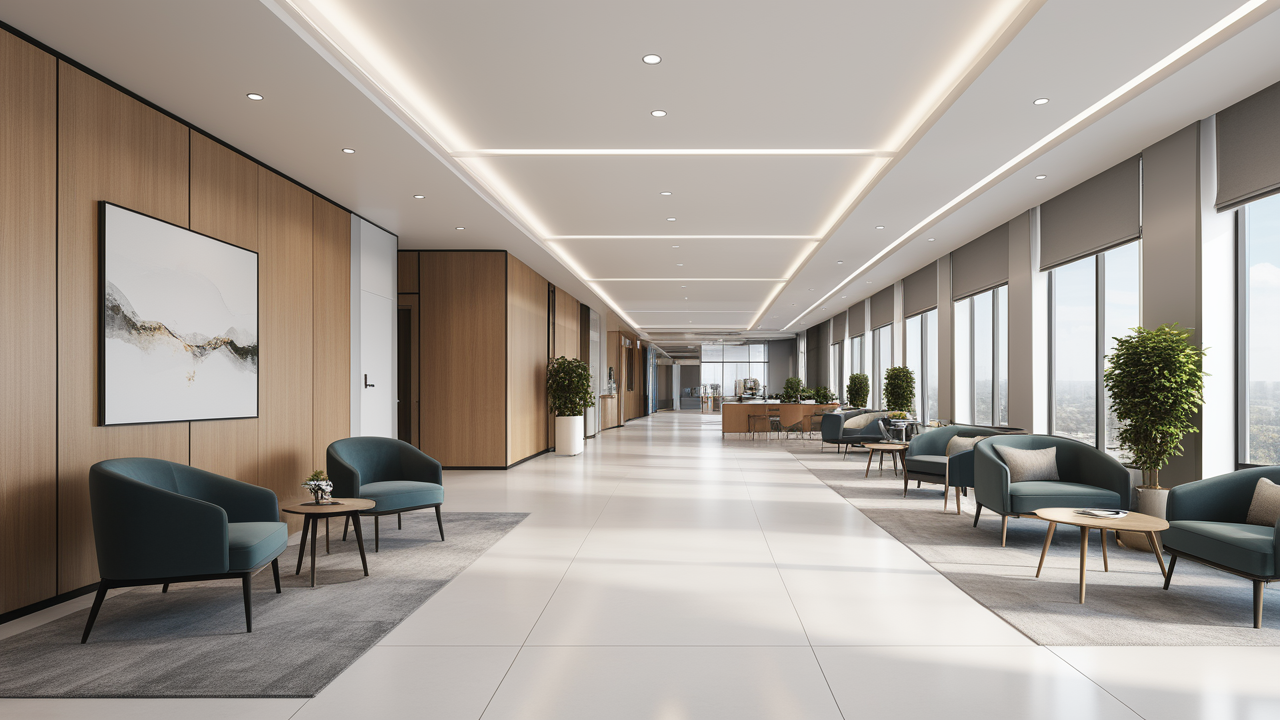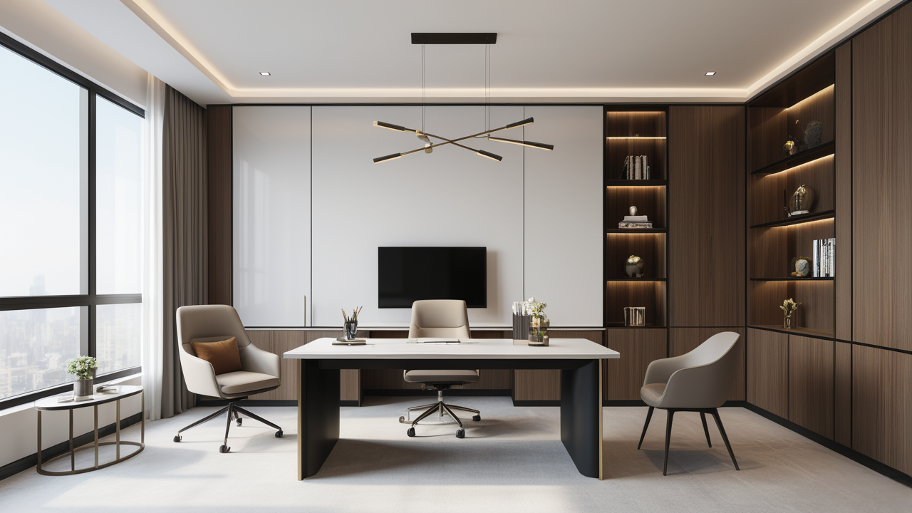 本案設(shè)計(jì)在處理上,特設(shè)計(jì)了可向客戶展示企業(yè)榮譽(yù)品的展示墻,用料實(shí)際,無(wú)須雕琢張揚(yáng),直線條的造型讓整個(gè)空間顯得穩(wěn)重大方,淺色系材料的運(yùn)用延續(xù)了靈動(dòng)而清澈的氣韻,大方莊重卻內(nèi)含現(xiàn)代時(shí)尚。而且色調(diào)淡雅的地毯、沙發(fā)、背景,還突出了接待廳親切、和睦、寬松的氛圍,使穩(wěn)靜而坦誠(chéng)的晤談氣氛盎然一室。