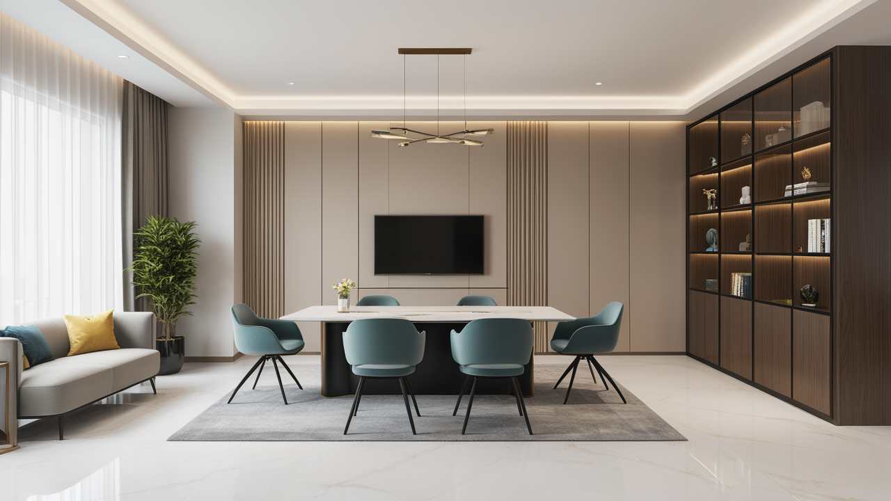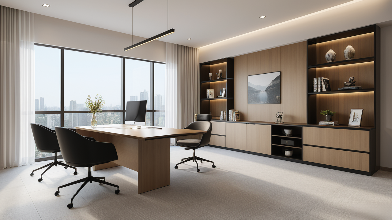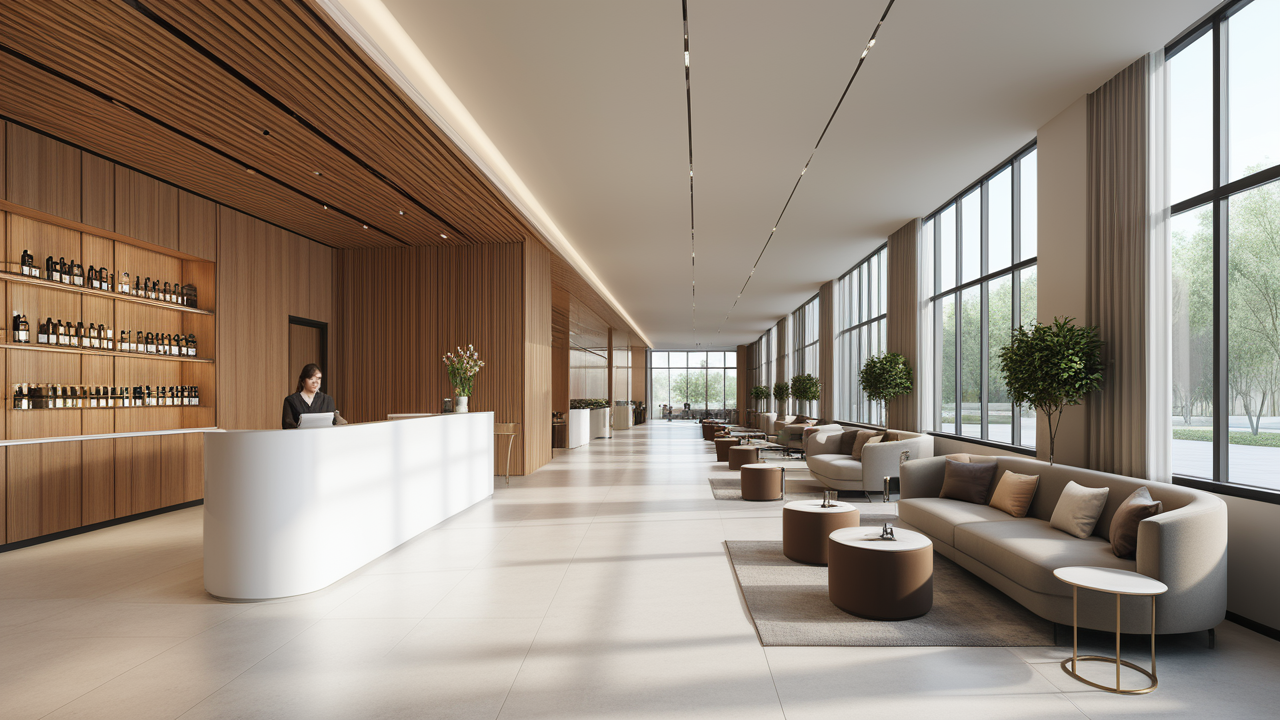 本案設(shè)計(jì)為突顯建筑開間較舒適之優(yōu)點(diǎn),設(shè)計(jì)師特意設(shè)計(jì)了過道各柱體間鑲嵌不銹鋼條及玻璃幕墻上的磨砂條來點(diǎn)綴的裝修主題,同時(shí),地面用拼花色帶打破,與方正而美觀的吊頂上下呼應(yīng);辦公室靠近走道的墻面,為將自然光透入走道,同時(shí)又加強(qiáng)其“靈透”感,采用清玻幕墻,幕墻上的磨砂條既打破了玻璃墻面的呆板,又提醒了行人幕墻的存在,防止無意識碰頭、沖撞等類似意外發(fā)生;為辦公室的后續(xù)私密性考慮,其清玻幕墻內(nèi)掛以百葉窗遮擋既可。