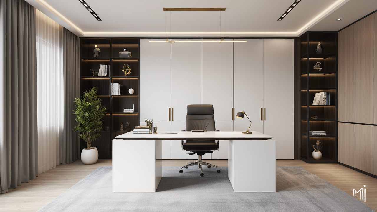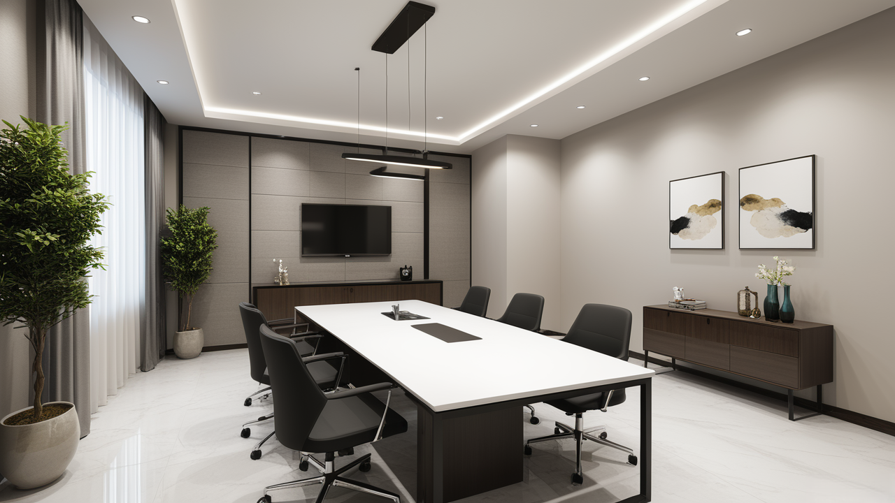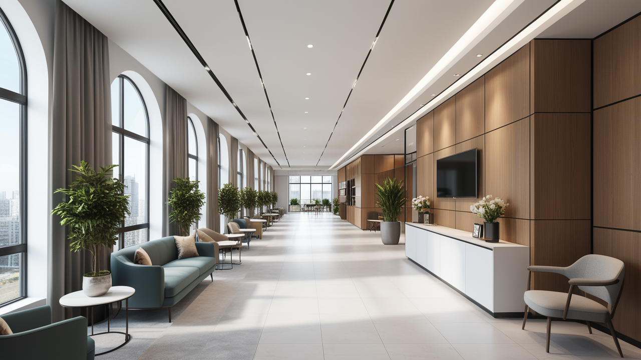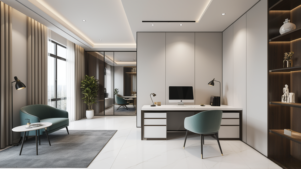 本案設(shè)計(jì)在處理上,特設(shè)計(jì)了可向客戶展示企業(yè)榮譽(yù)品的展示墻,用料實(shí)際,無(wú)須雕琢張揚(yáng),直線條的造型讓整個(gè)空間顯得穩(wěn)重大方,淺色系材料的運(yùn)用延續(xù)了靈動(dòng)而清澈的氣韻,大方莊重卻內(nèi)含現(xiàn)代時(shí)尚。而且色調(diào)淡雅的地毯、沙發(fā)、背景,還突出了接待廳親切、和睦、寬松的氛圍,使穩(wěn)靜而坦誠(chéng)的晤談氣氛盎然一室。