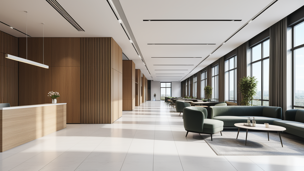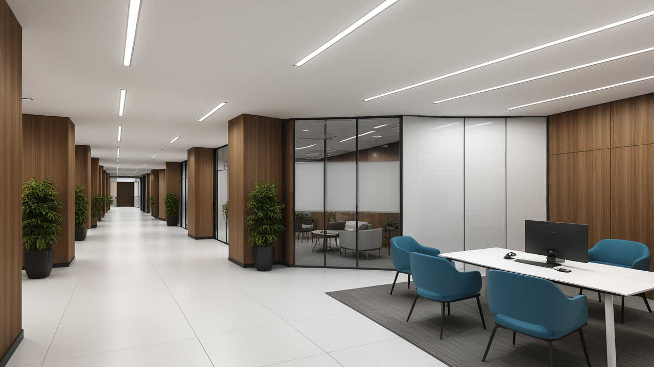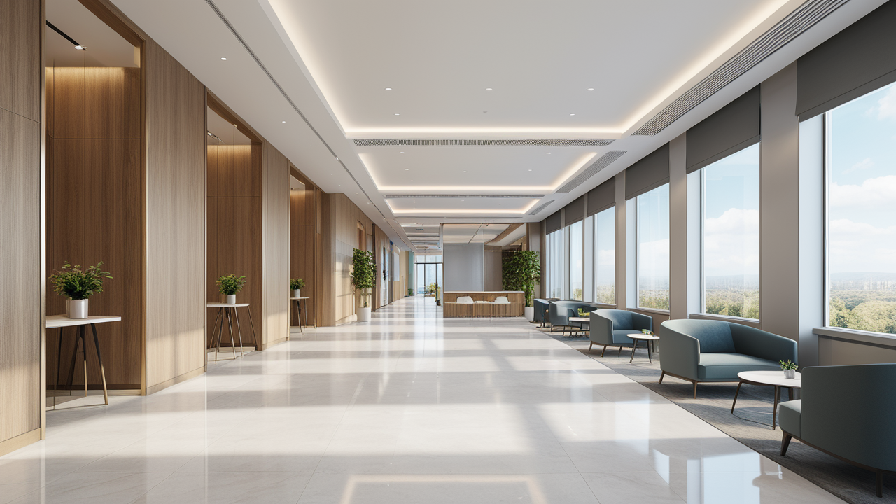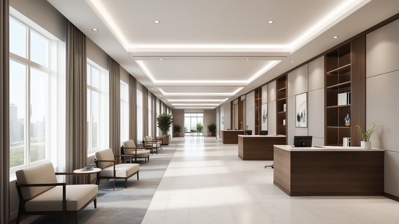 本案設計為突顯建筑開間較舒適之優(yōu)點,設計師特意設計了過道各柱體間鑲嵌不銹鋼條及玻璃幕墻上的磨砂條來點綴的裝修主題,同時,地面用拼花色帶打破,與方正而美觀的吊頂上下呼應;辦公室靠近走道的墻面,為將自然光透入走道,同時又加強其“靈透”感,采用清玻幕墻,幕墻上的磨砂條既打破了玻璃墻面的呆板,又提醒了行人幕墻的存在,防止無意識碰頭、沖撞等類似意外發(fā)生;為辦公室的后續(xù)私密性考慮,其清玻幕墻內(nèi)掛以百葉窗遮擋既可。
