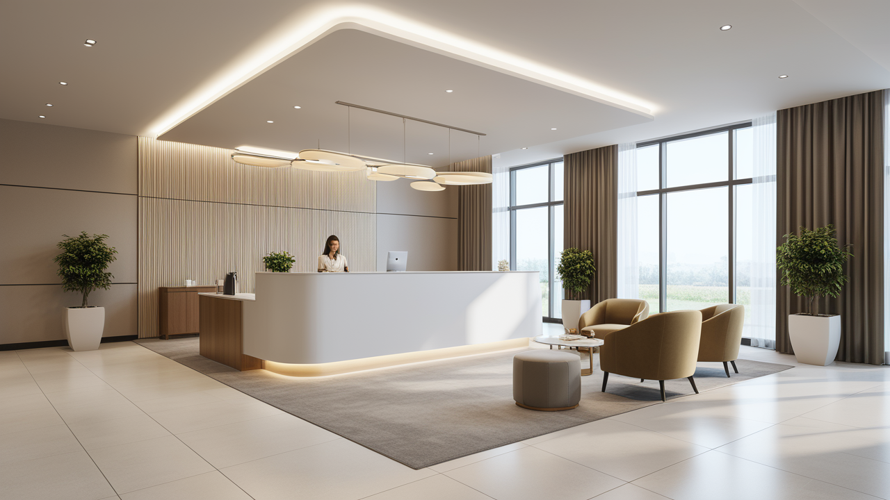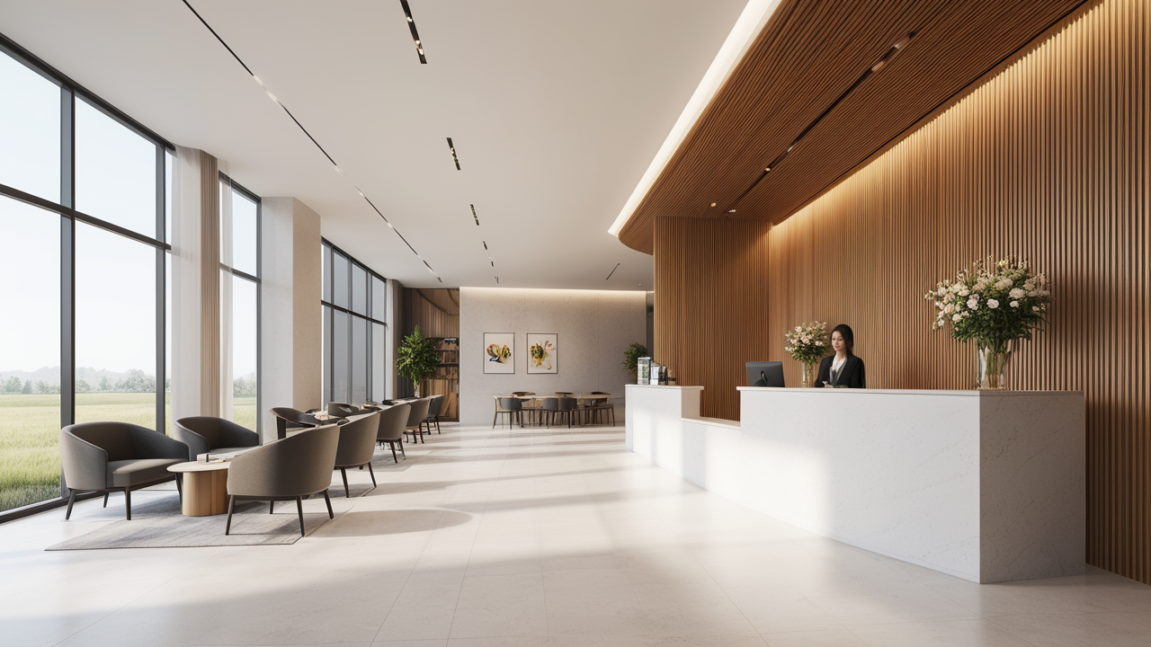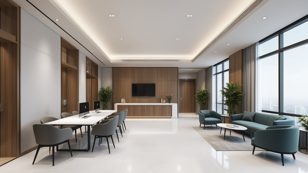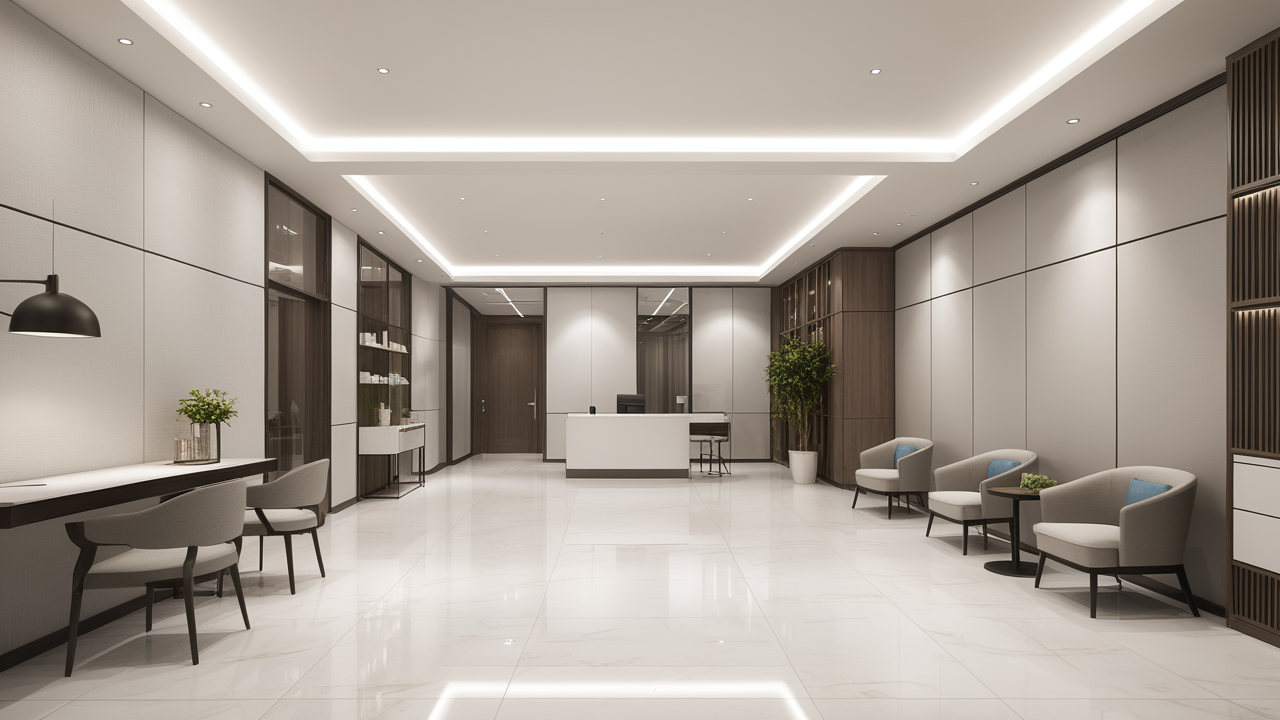 本案設計為突顯建筑開間較舒適之優(yōu)點,設計師特意設計了過道各柱體間鑲嵌不銹鋼條及玻璃幕墻上的磨砂條來點綴的裝修主題,同時,地面用拼花色帶打破,與方正而美觀的吊頂上下呼應;辦公室靠近走道的墻面,為將自然光透入走道,同時又加強其“靈透”感,采用清玻幕墻,幕墻上的磨砂條既打破了玻璃墻面的呆板,又提醒了行人幕墻的存在,防止無意識碰頭、沖撞等類似意外發(fā)生;為辦公室的后續(xù)私密性考慮,其清玻幕墻內(nèi)掛以百葉窗遮擋既可。